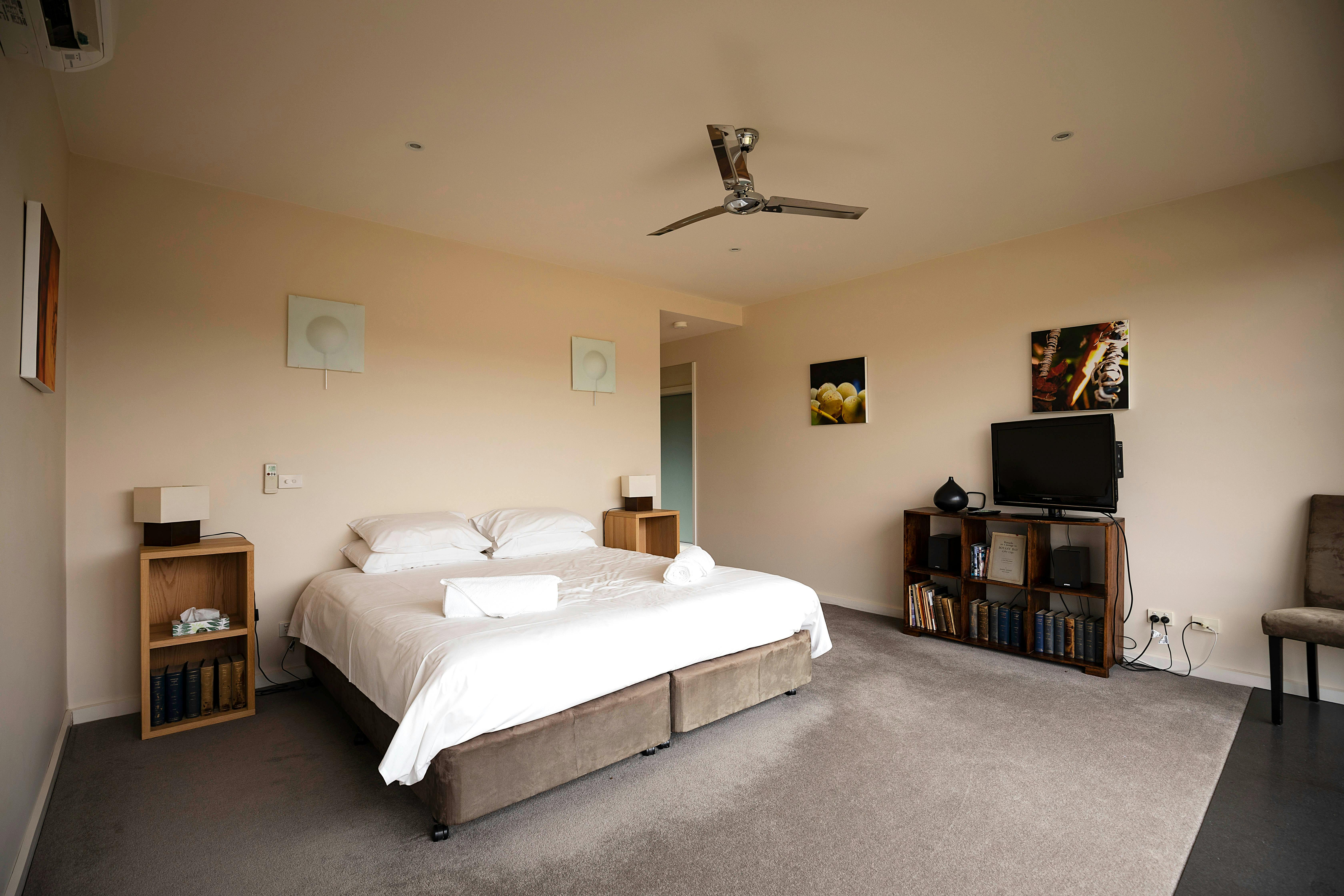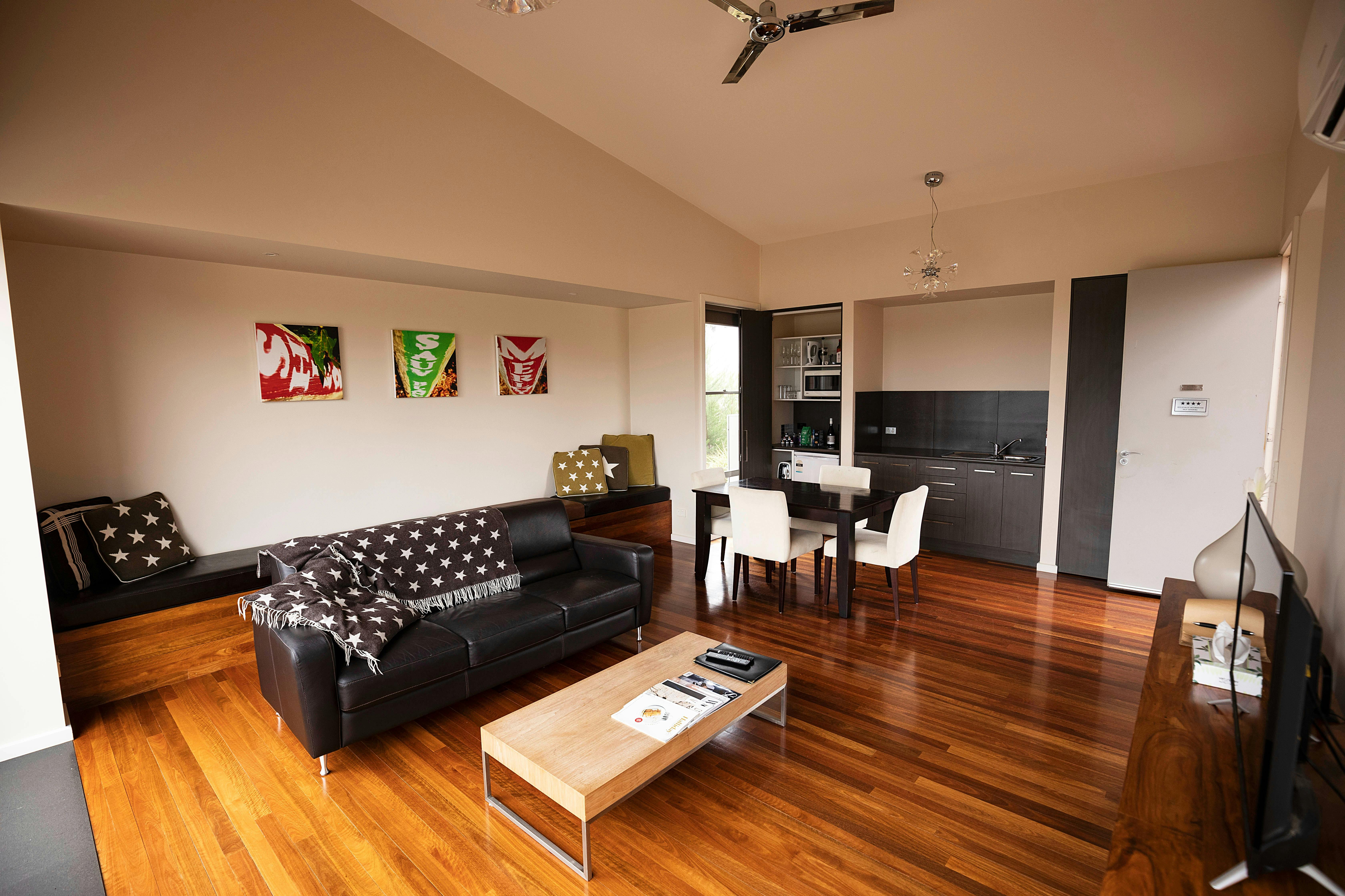 Nestled amongst the picturesque organic vineyard and olive grove, Eco-Luxe at Mount Avoca blends a balance of luxury with an eco-sensibility, perfect for couples and romantic getaways. As with Mount Avoca's outstanding organic wines, eco-luxe is a delightful mix of elegance and style. Tranquility is key in these three, beautiful self-contained lodges. Large picture windows overlooking the magnificent backdrop of Mount Avoca and the Pyrenees Range set the tone to recharge and unwind. Luxuriously appointed king bedrooms feature beautiful linen and overlook vines, as do the travertine lined spa bathrooms. A second bedroom offers bunk beds for two. A large living area with kitchenette opens onto a balcony with views of the Pyrenees Ranges. Sit and enjoy a glass of wine as the sun goes down. Wall to wall windows offer postcard views from both the bedroom and living room. The decadent bathroom features shower, spa-bath and shines with natural light. Eco-Luxe also reflects the vineyards' environmental values. Architecturally designed to maximise passive heating and cooling, eco-friendly materials minimise the carbon foot-print. Cladding is plantation grown native Australian Cypress-pine while floors are native spotted gum. Each lodge has its own water tank and biological sewerage treatment.
