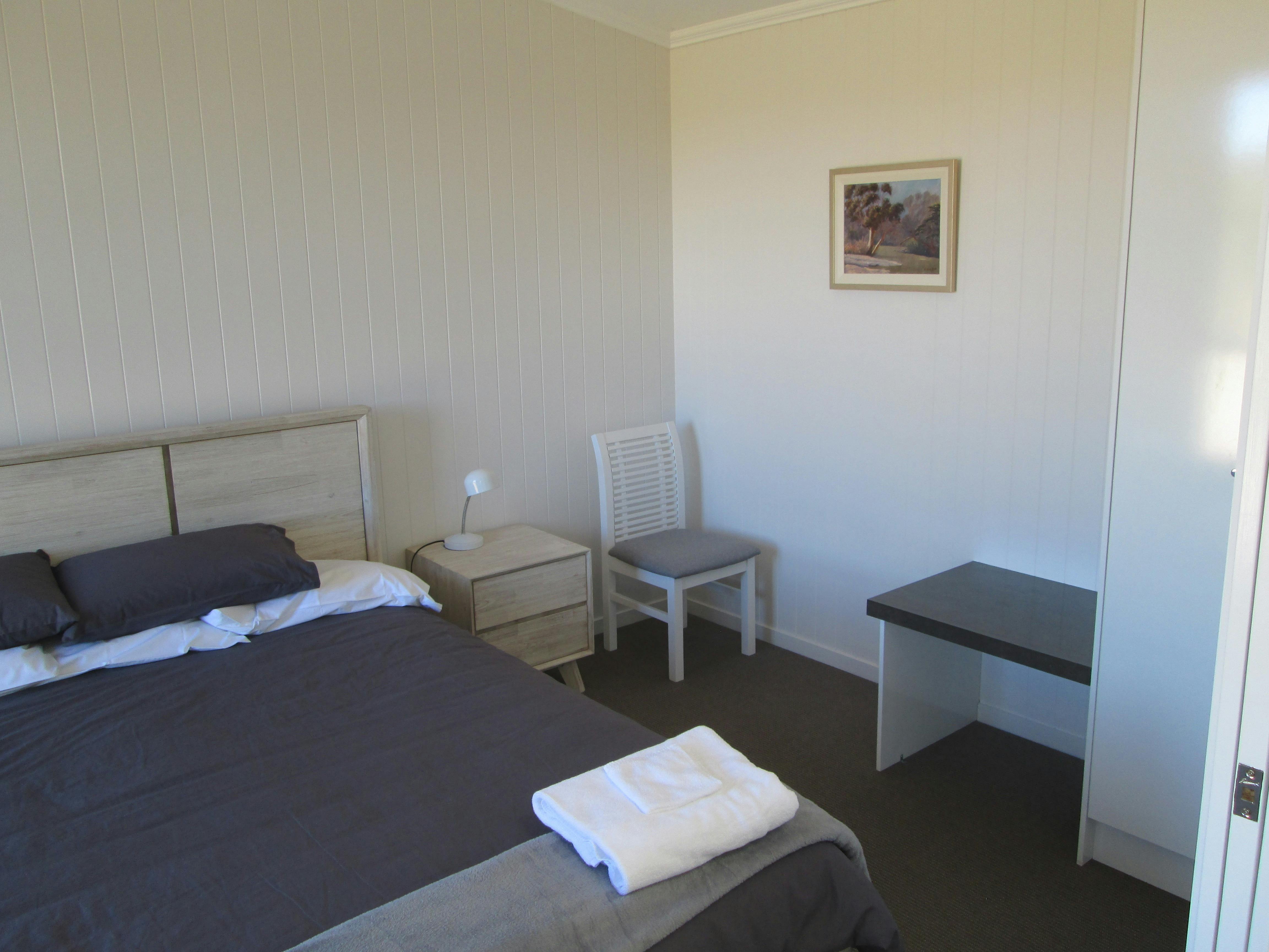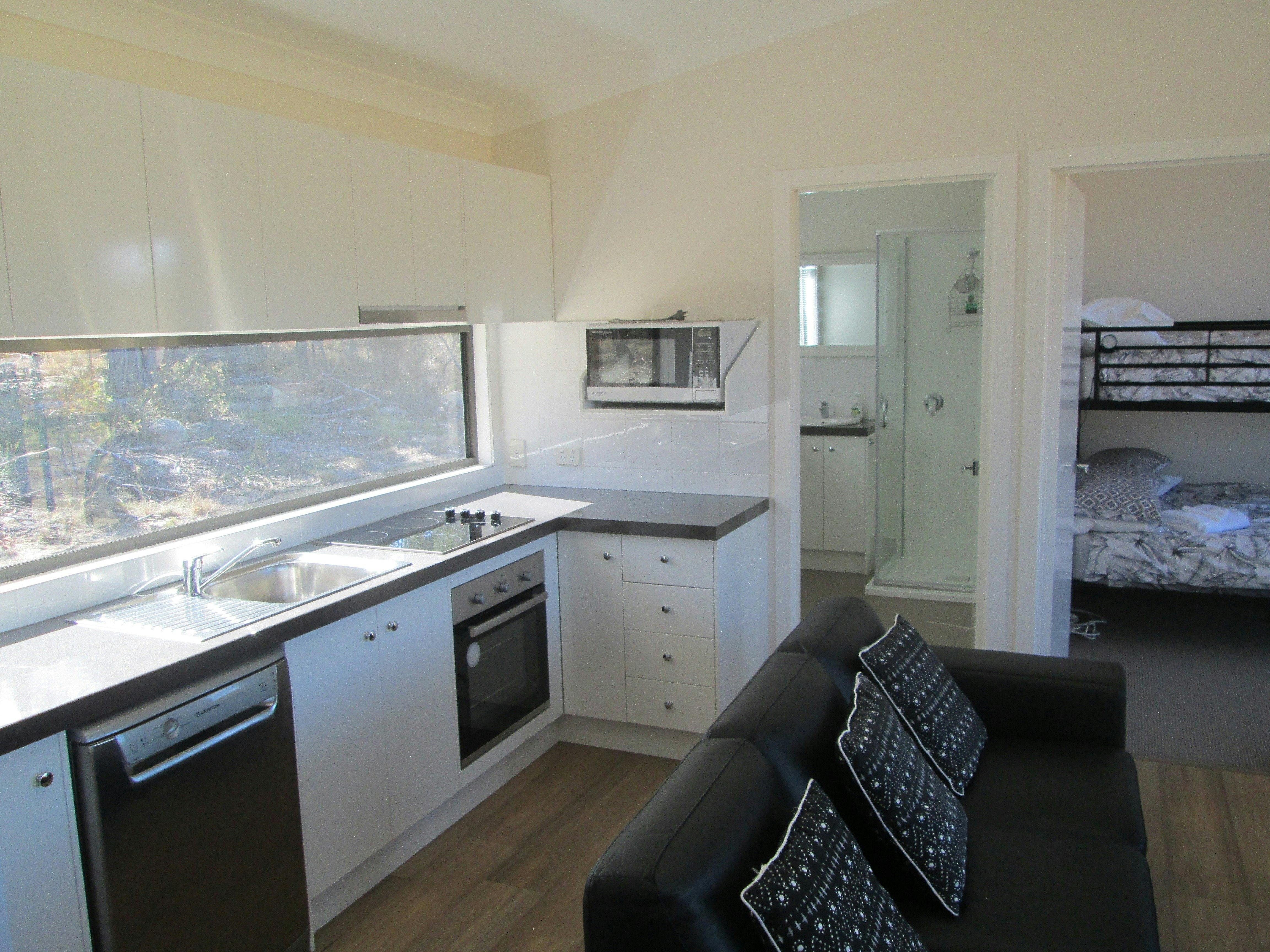 Cabins are especially suited to couples or families up to four. Each cabin has a master bedroom with a king-size bed. Second bedroom has an over and under bunk – double on the bottom and single on top. Self-contained kitchen with stove, microwave, full sized fridge and dishwasher.