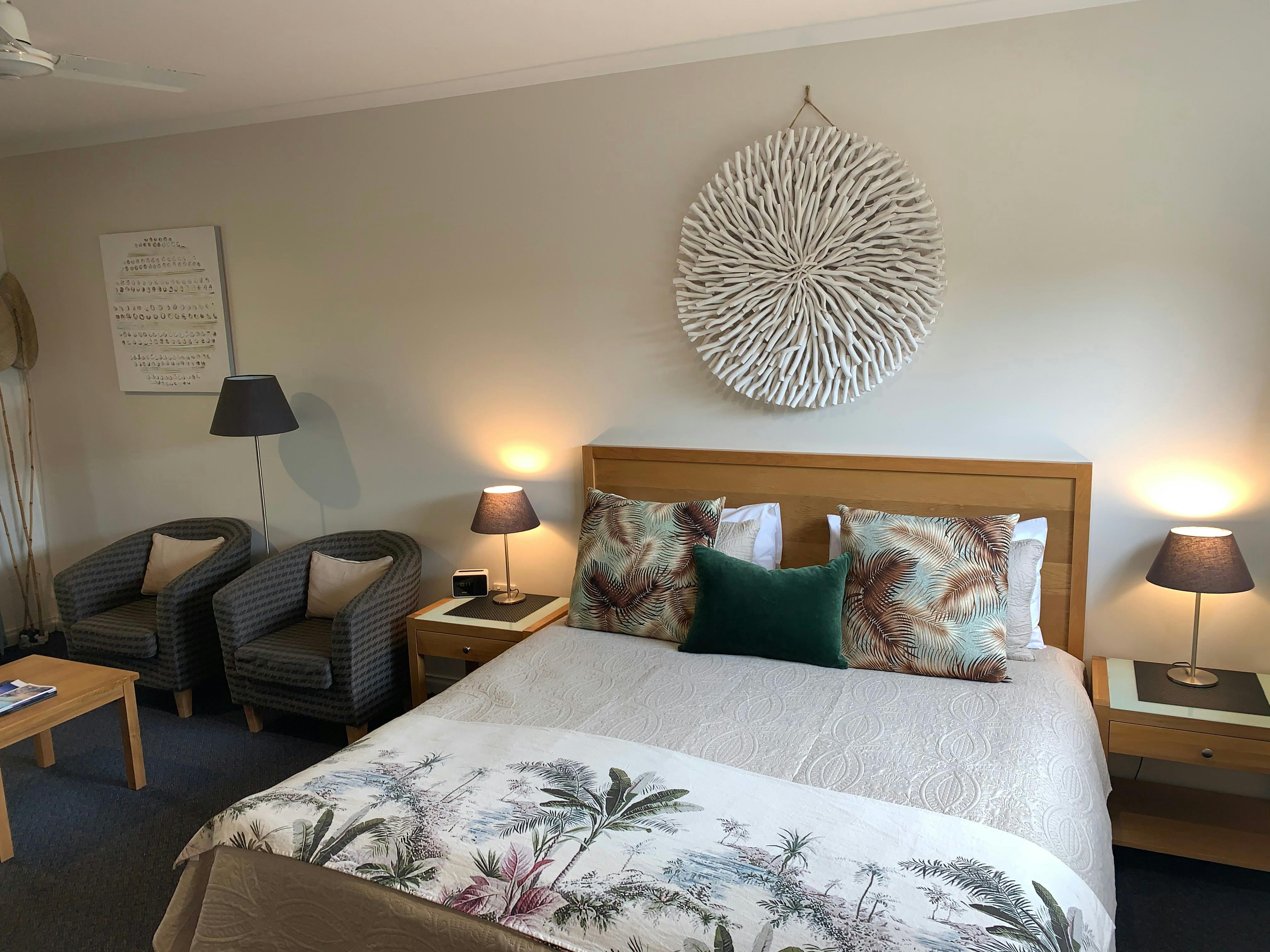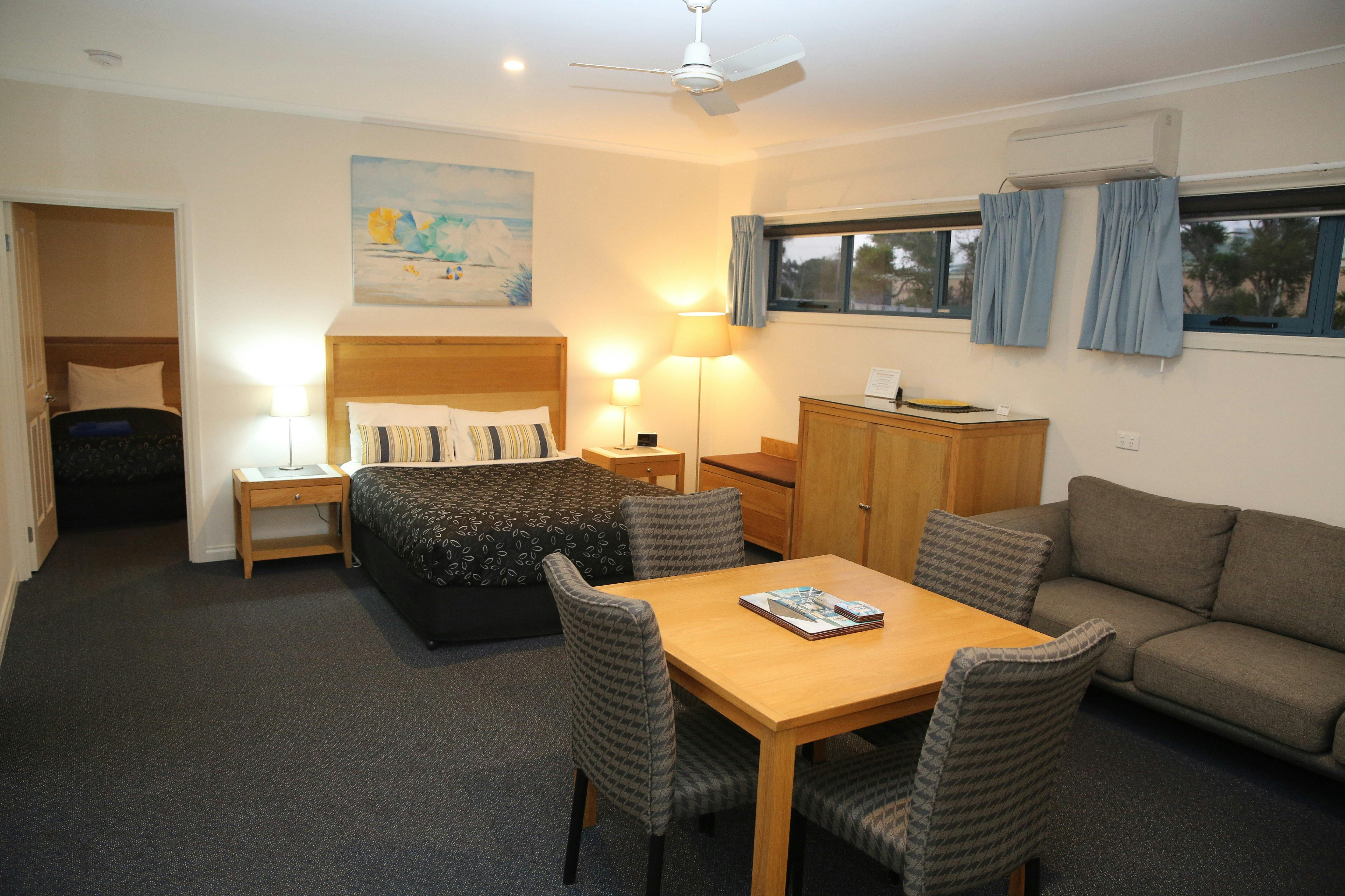 Large spacious bedrooms with cosy furnishings and a separate bathroom. Comfortable beds, climate-controlled temperature, bar fridge with amenities and condiments supplied. All bed linen and towels are provided including daily room servicing.