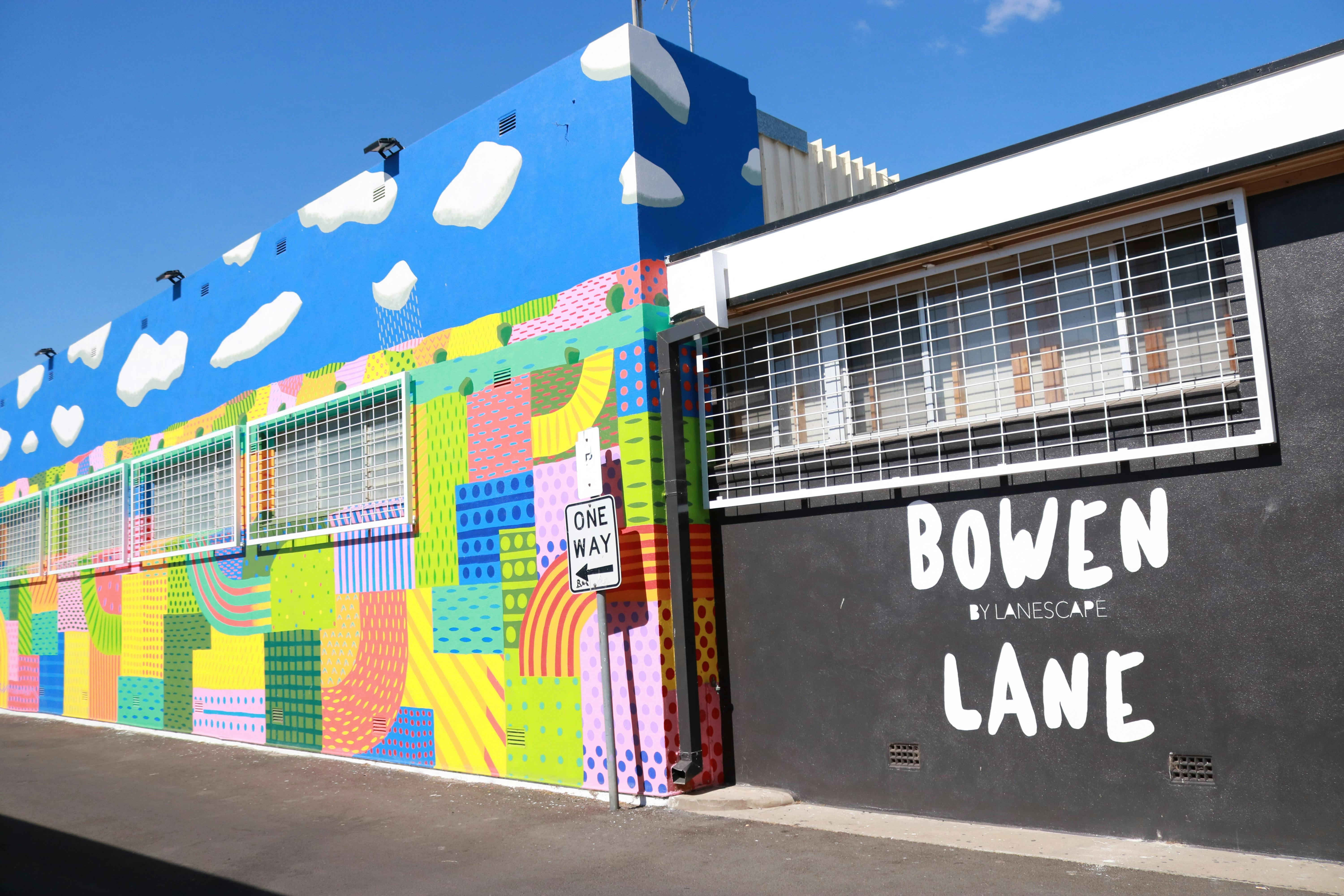 As James was driving through town, he noticed the blank wall of the Gunsynd Motor Inn and decided to approach the owner about the possibility of bringing the wall to life. They agreed, and James painted Gunsynd - the Goondiwindi Grey and Australian icon - on a vibrant outback backdrop.