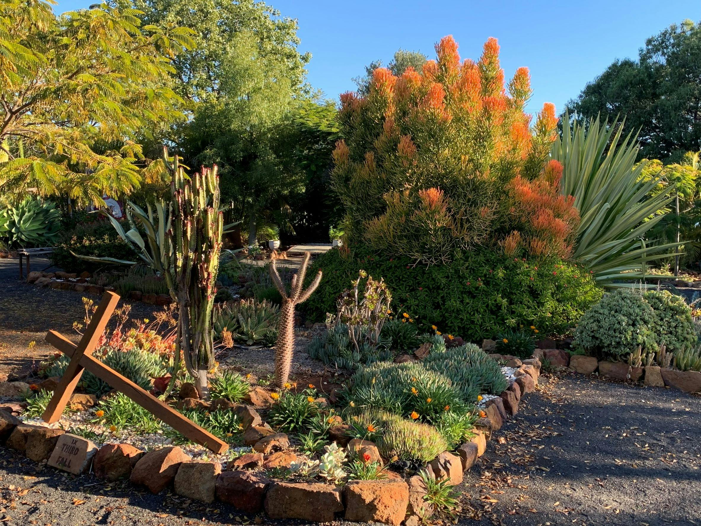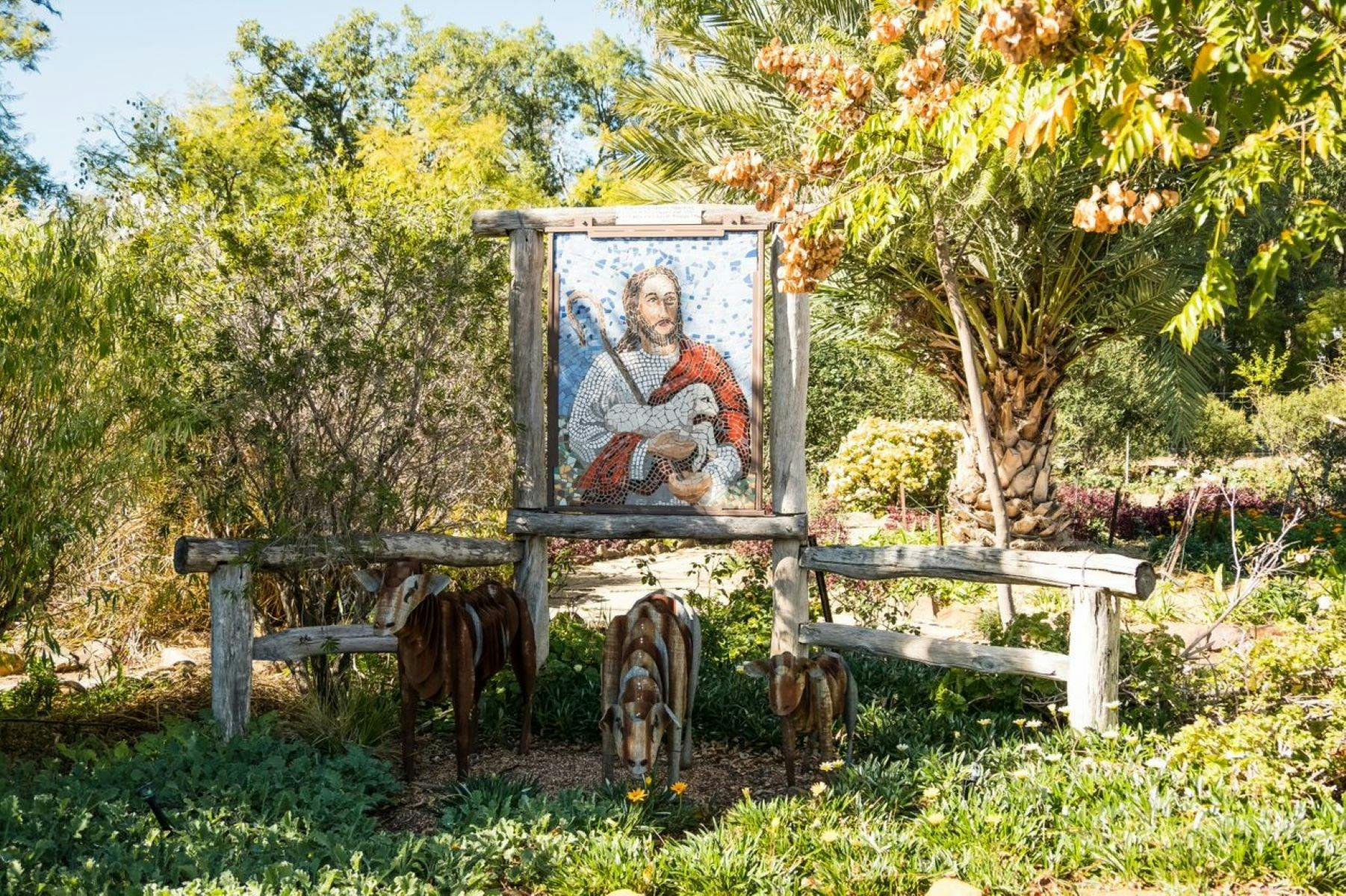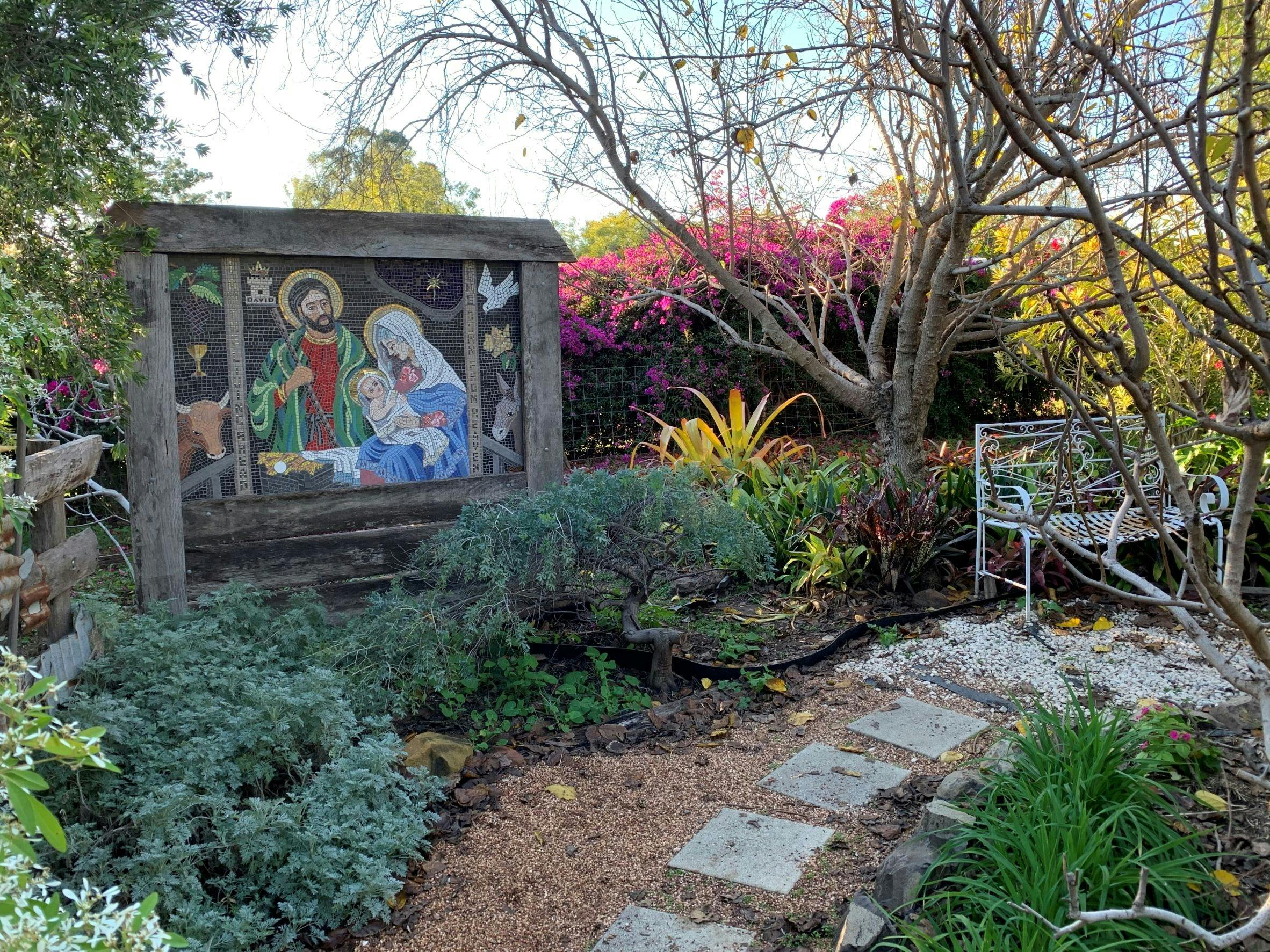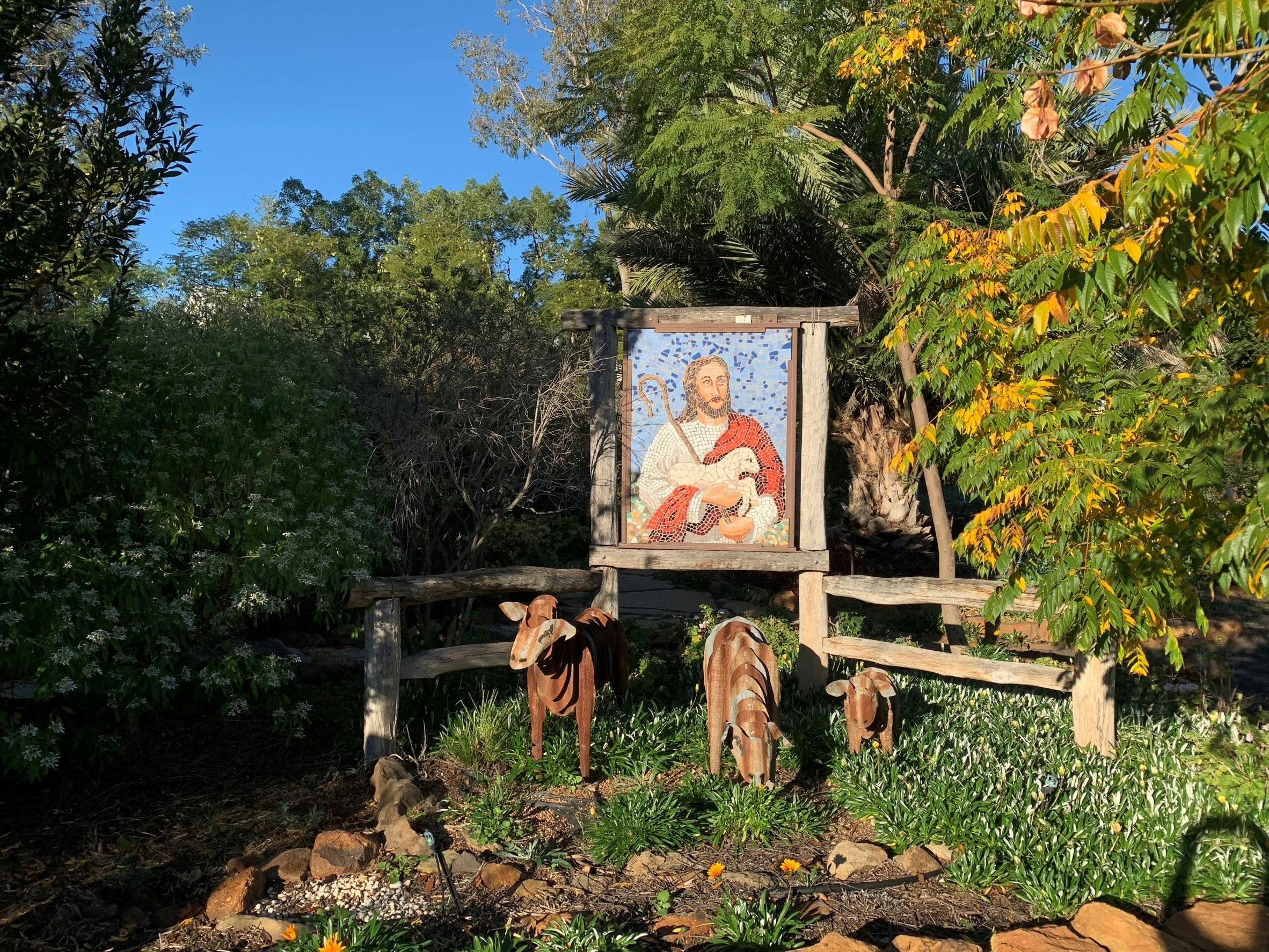 The vision was to use as many trees and plants mentioned in the Bible and to incorporate a Way of the Cross in a garden setting. It is also home to an impressive and varied collection of artworks from quirky pieces created from 'Australian' mediums like old timber, steel and barbed wire along to more traditionally styled mosaic creations. Included in the garden is a memorial to the shepherds who worked in the area when it was part of Jimbour Station.