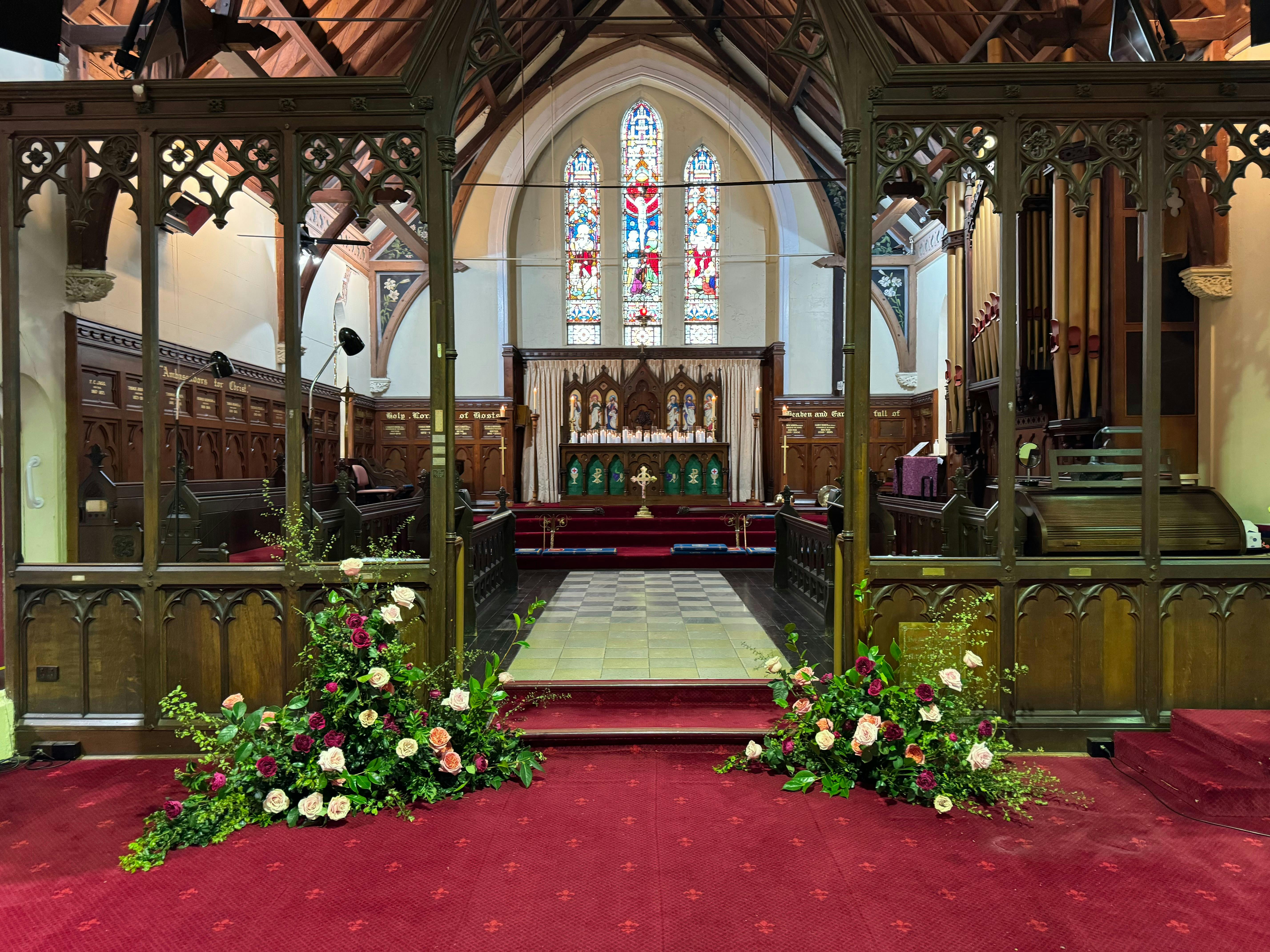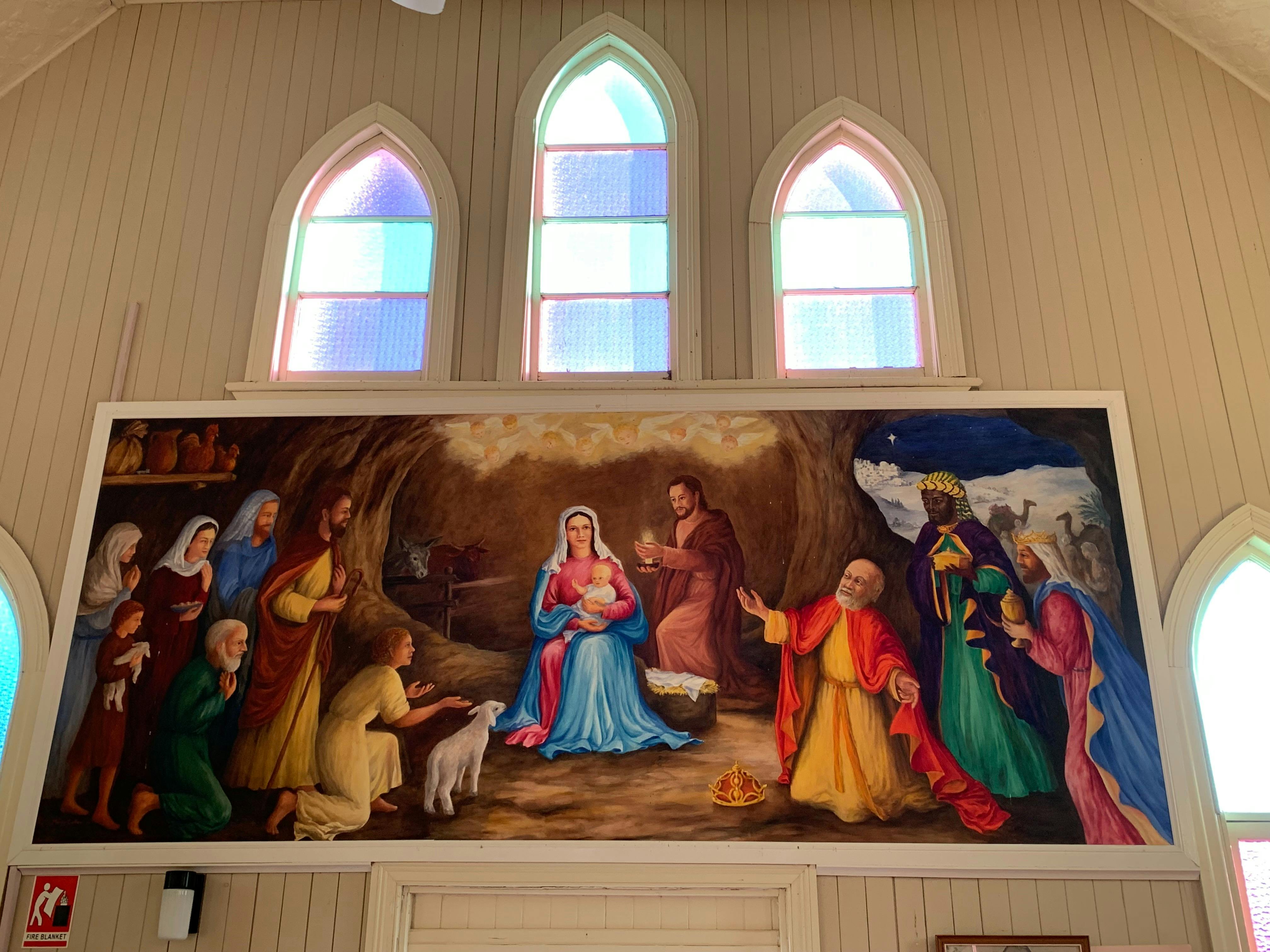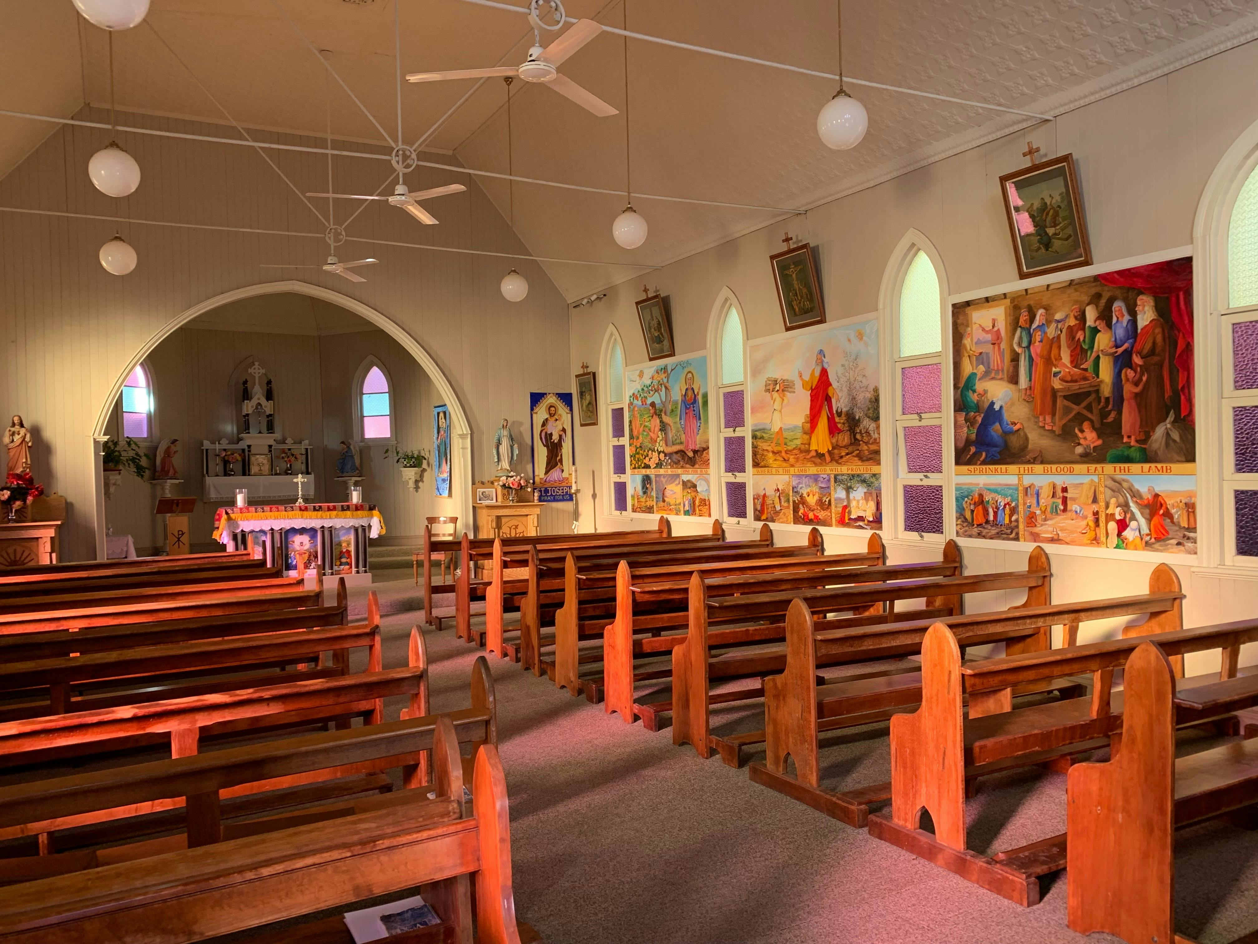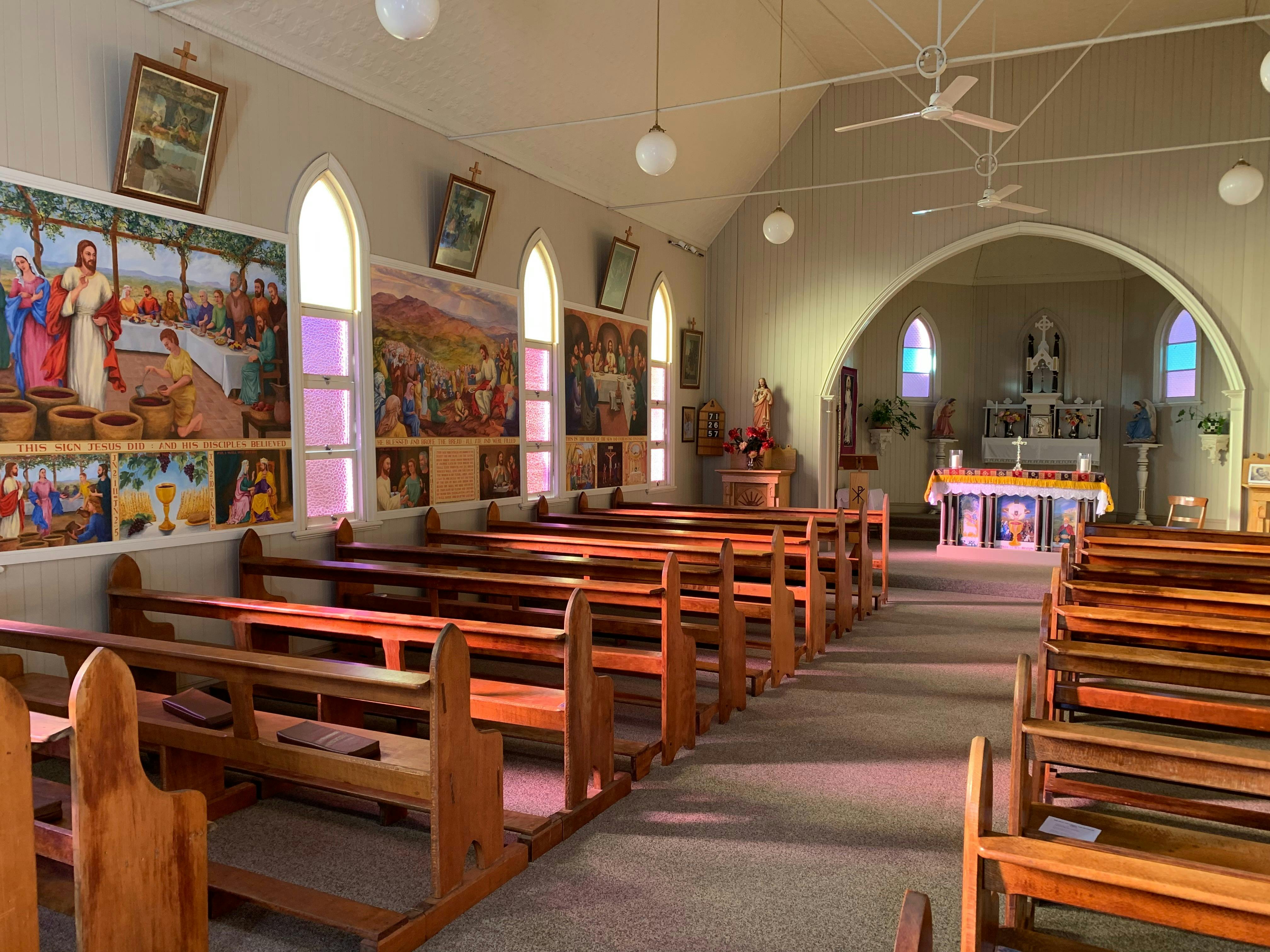 Inside the Bell Catholic Church is a series of eleven paintings portraying a pictorial history of salvation as told through the Old and New Testaments of the Bible. The original series of paintings on the side walls of the Church were completed for the Church's 95th anniversary.