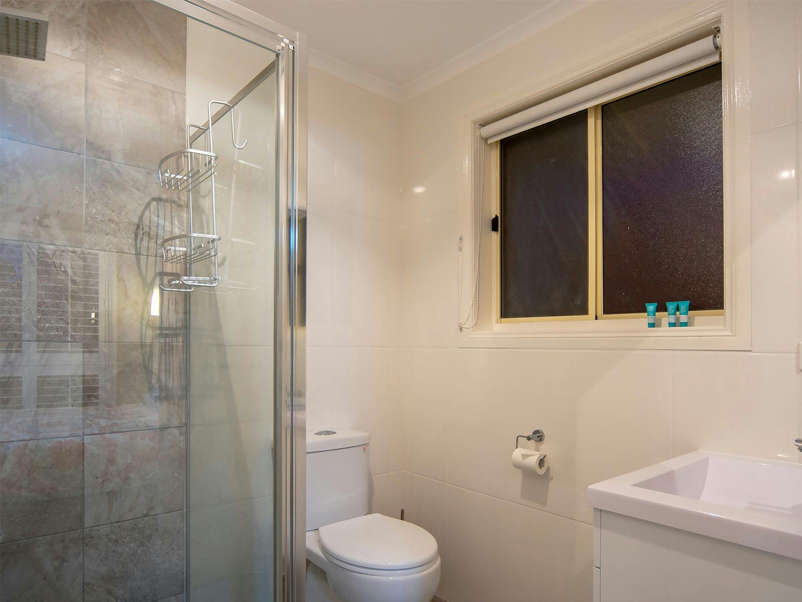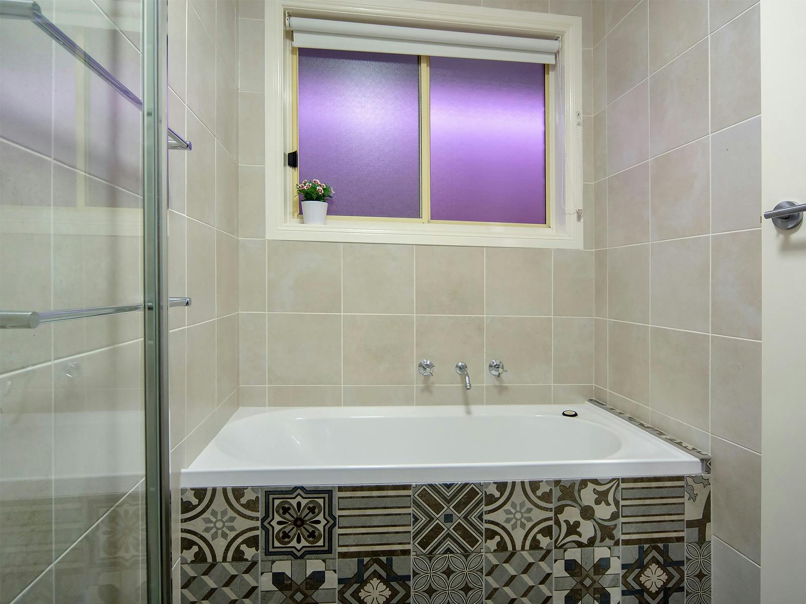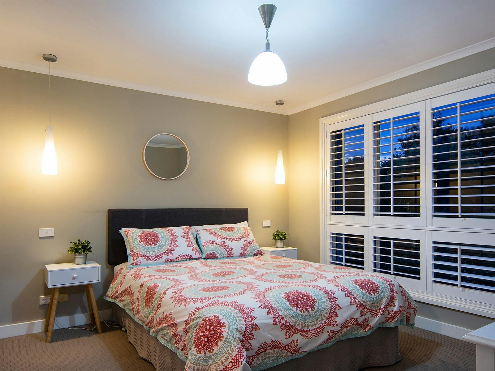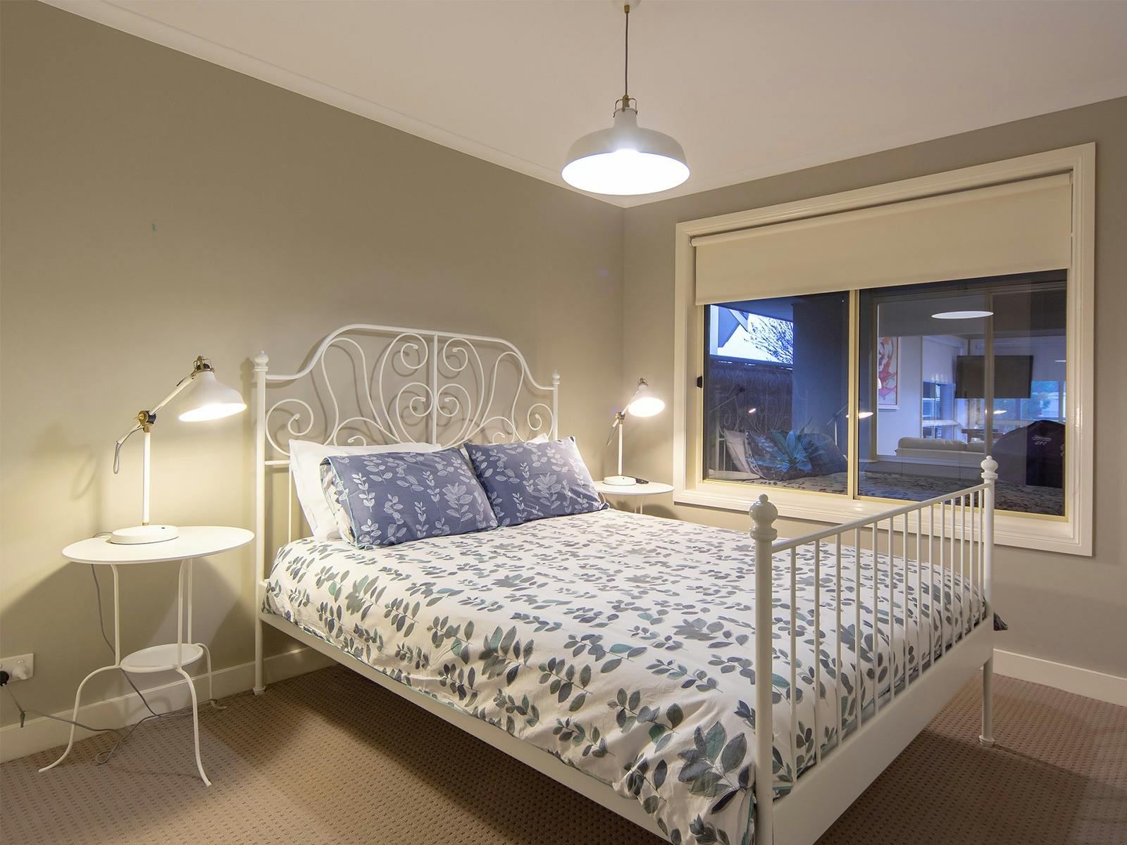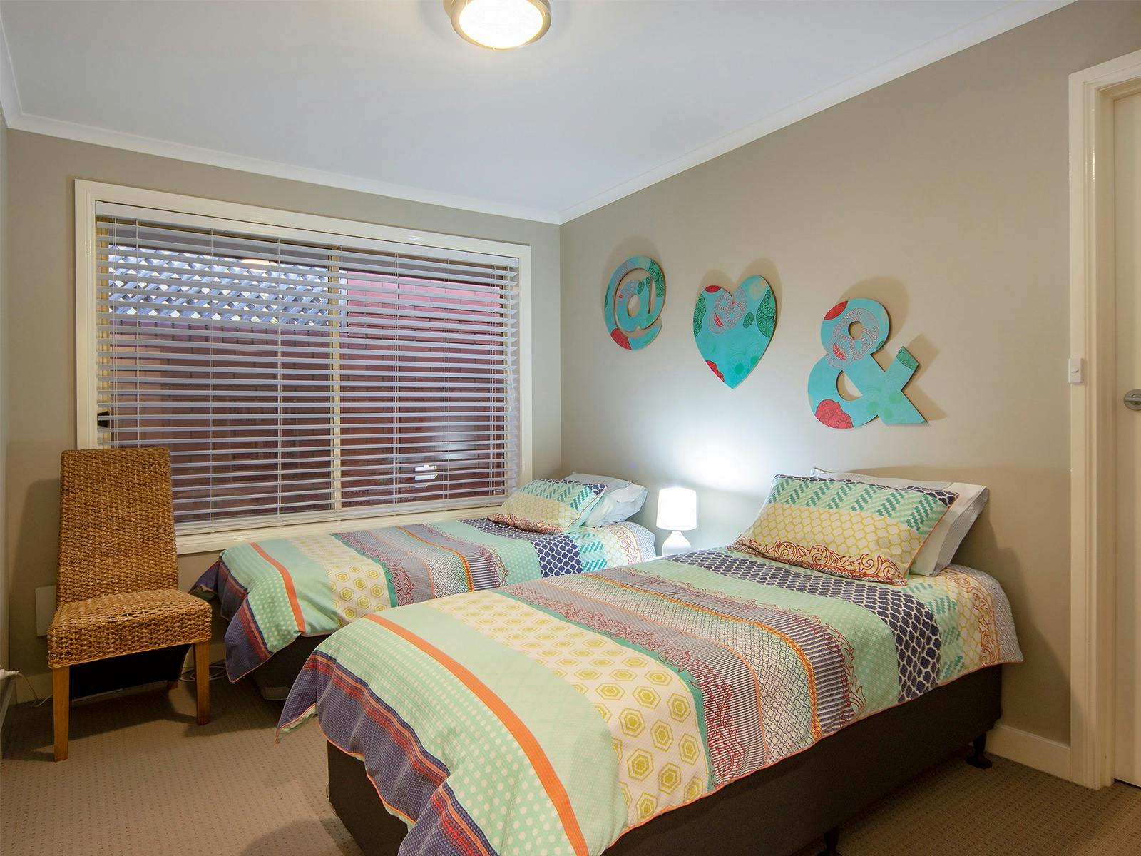 The main ensuite QB room features plantation shutters. The second QB room has views through the courtyard to the lake. Bedroom three has two single beds, so the house sleeps six.