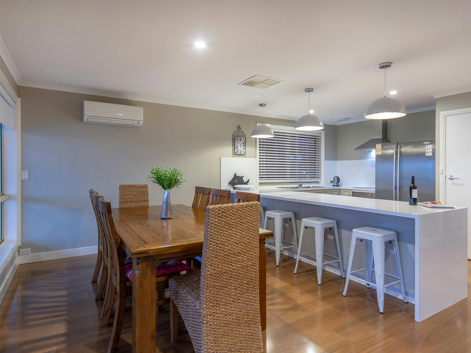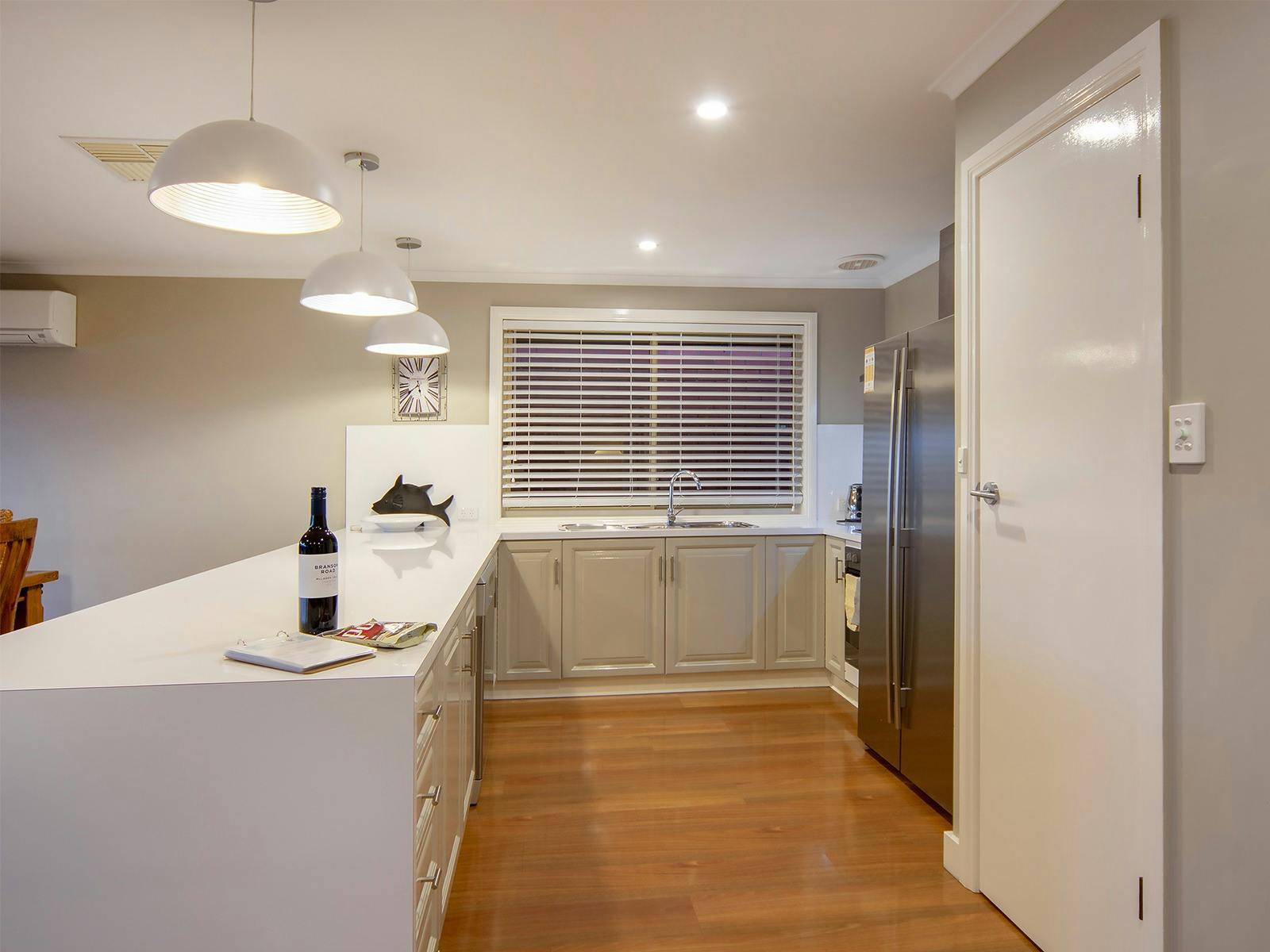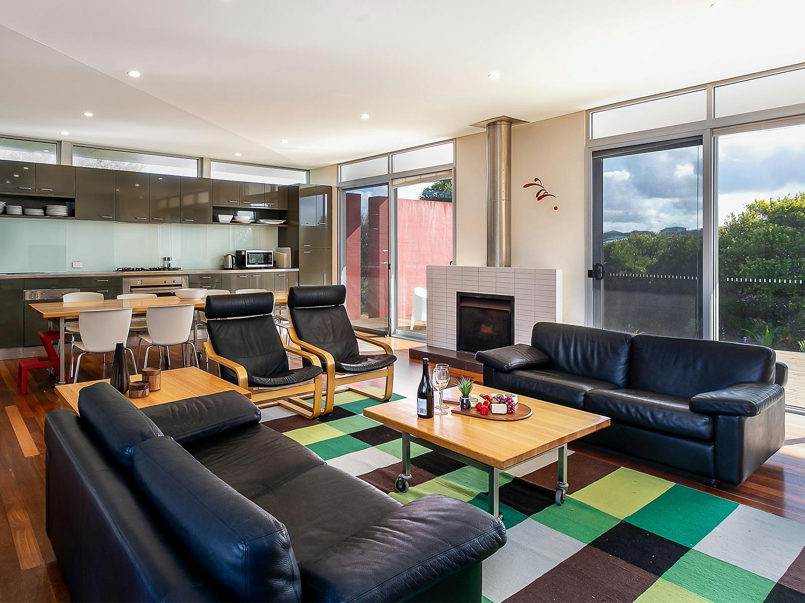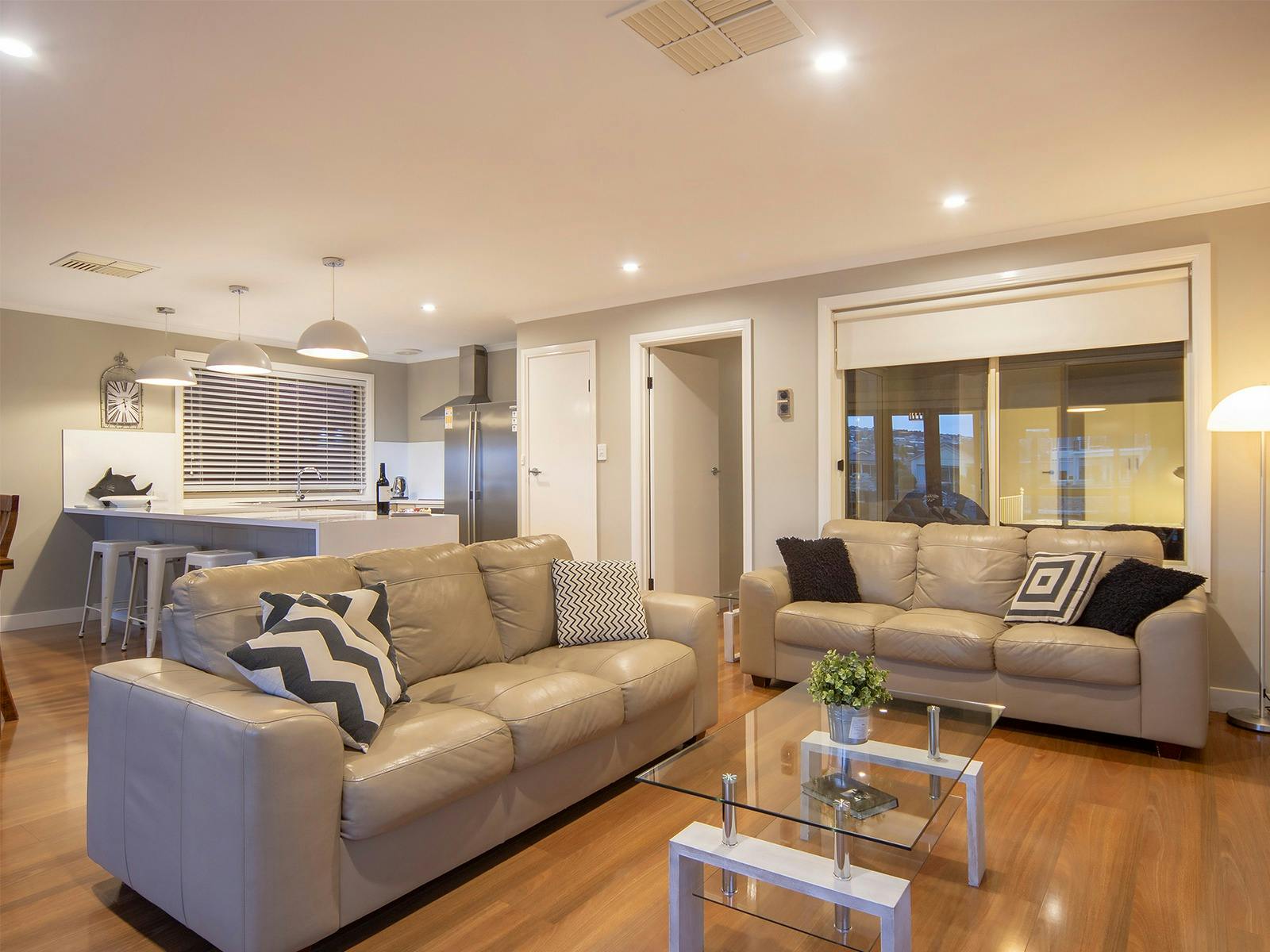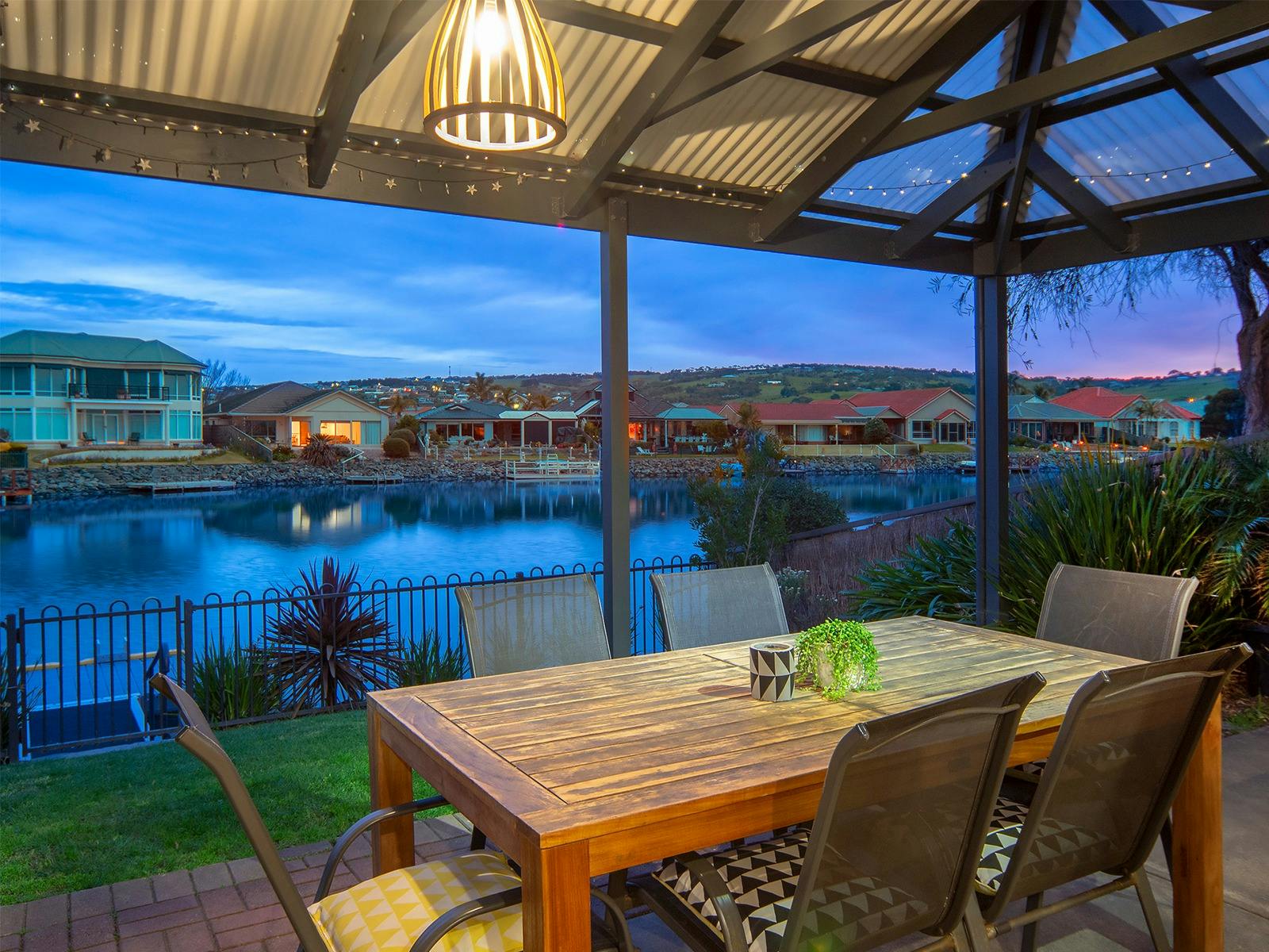 Pet Let specialises in contemporary homes like this, immaculately presented with the unique advantage of welcoming your pets inside. Just bring a cover for the furniture. Everything else is provided. The deck has a pergola, and the garden is enclosed. Kayaks and canoes are provided for a 4km lap of Encounter Lakes.