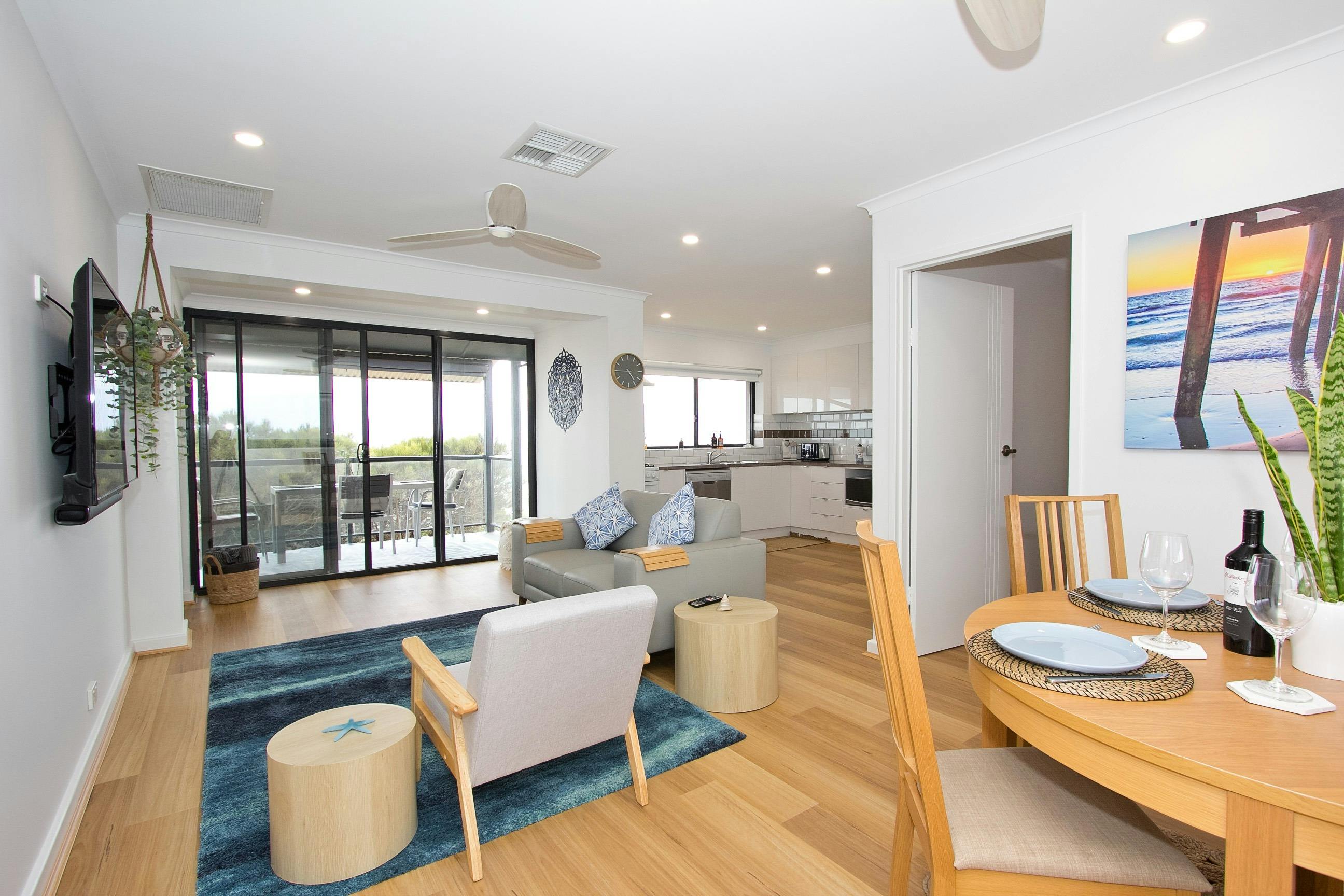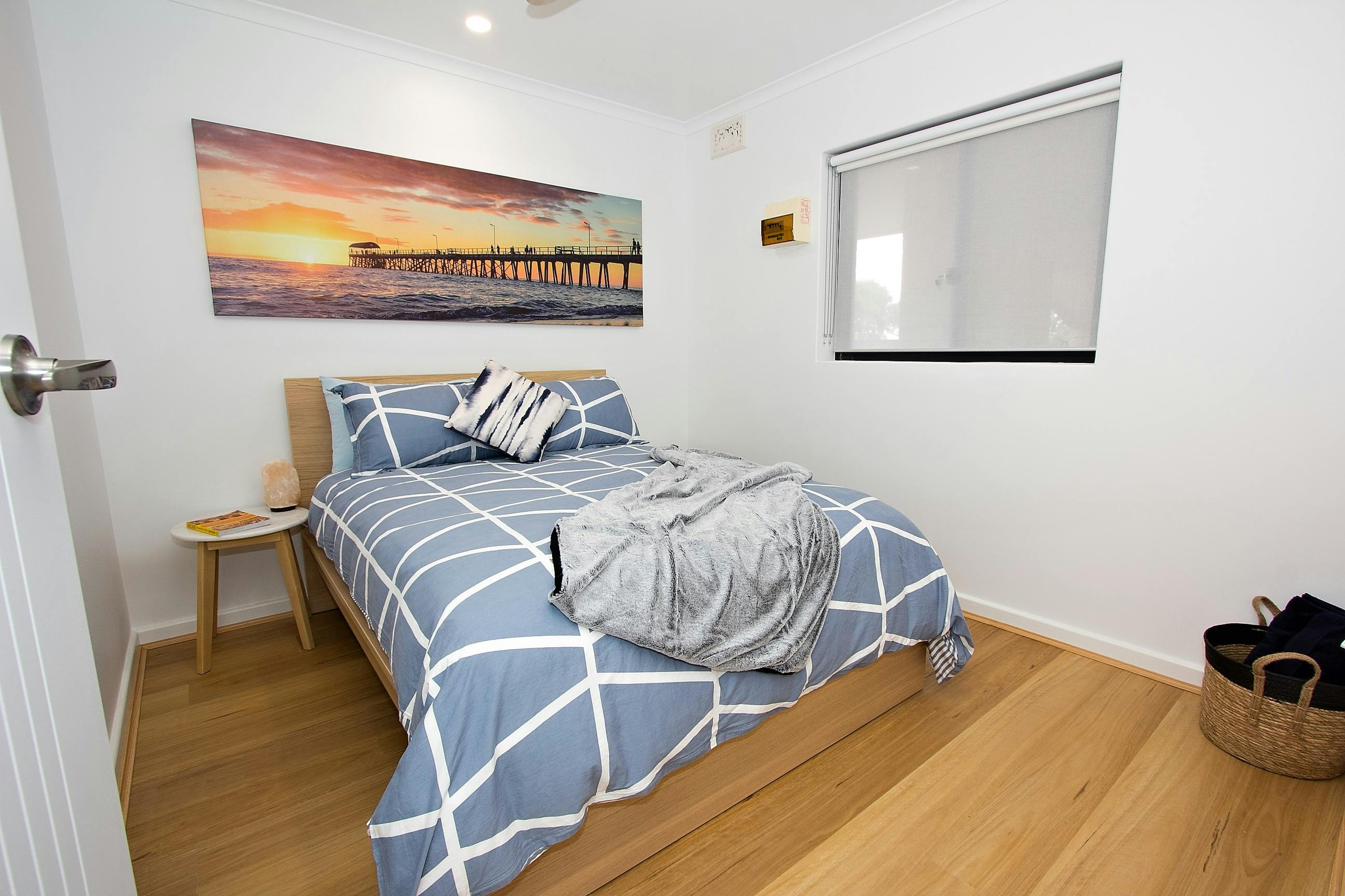 Welcome to your modern, upstairs beachfront escape stylish two-bedroom apartment perfectly suited for up to four guests. Cot and highchair can also be provided upon request. Inside, you'll find two comfortable bedrooms the main with a king size bed, and the second a double bed. A 2-minute stroll from the Semaphore Park Beach entrance, this peaceful retreat is the ideal spot to unwind, with nothing but the gentle sounds of the ocean to lull you to sleep. Step out onto the balcony to take in uninterrupted ocean views, the perfect place to enjoy a coffee, breathtaking sunsets, or simply relax. The fully equipped modern kitchen has everything you need for your stay, and the bathroom offers all the comforts of home. For entertainment, they provide a variety of indoor and outdoor games, a blow-up paddle board and life jackets for those looking to get out on the water. An undercover parking space for one vehicle is included, and you can choose to dine indoors or al fresco. Just a short walk away is Pt Malcolm Reserve, where you'll find tennis courts (rackets and balls provided), a basketball court, BBQ facilities, and sheltered seating areas. The scenic coastal path runs right past your door perfect for a walk or bike ride from Semaphore Park to North Haven, all while soaking in the stunning beachfront.
