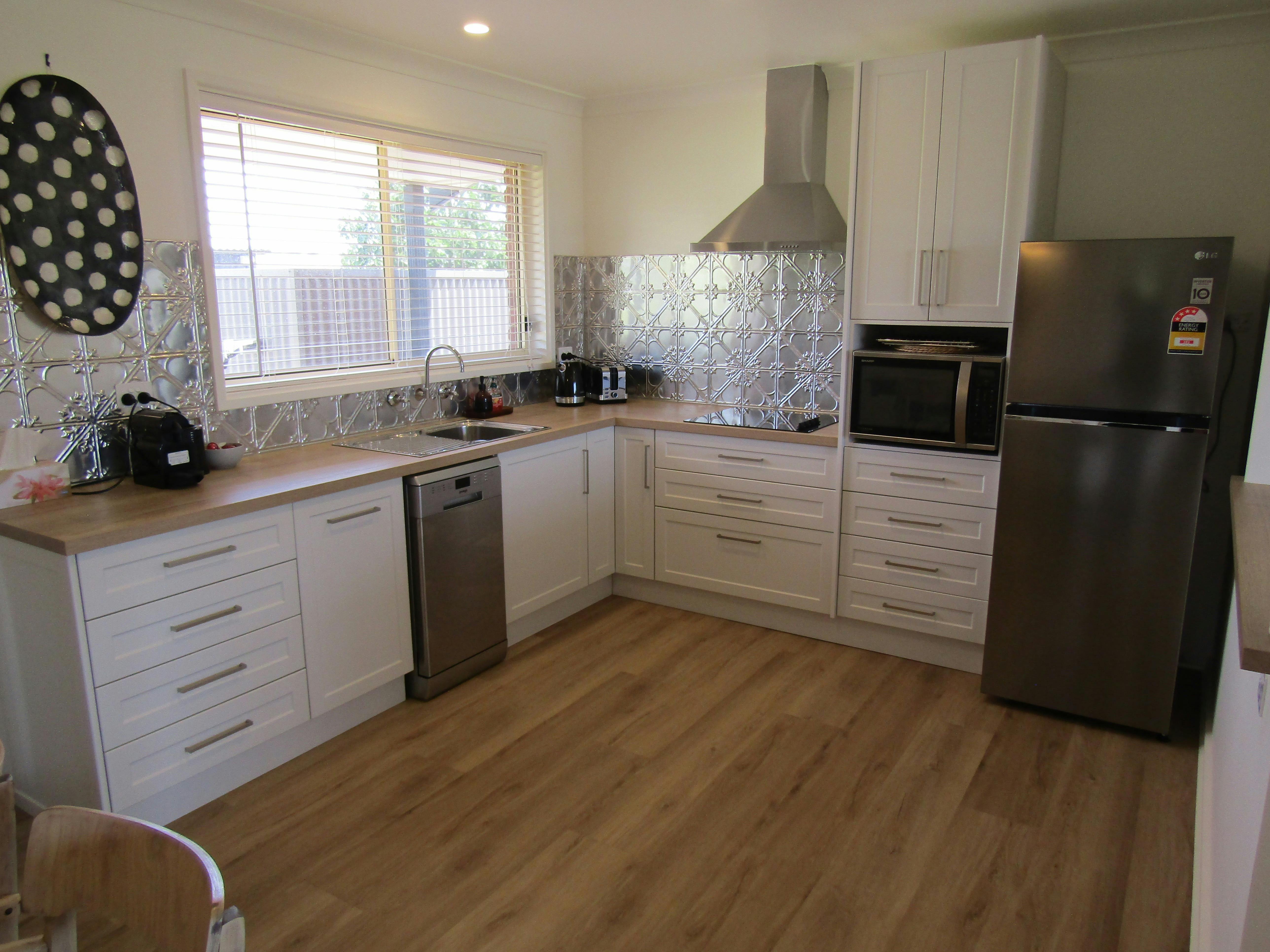 Open plan modern kitchen with cook top, no oven but there is a convention and grill microwave, fridge/freezer, small dishwasher, rice cooker, toaster, kettle, Delonghi coffee pod machine (BYO pods ). Dining and a living area with reverse cycle air-conditioner, large smart TV, bluetooth speakers, views of the ocean. Free Wifi