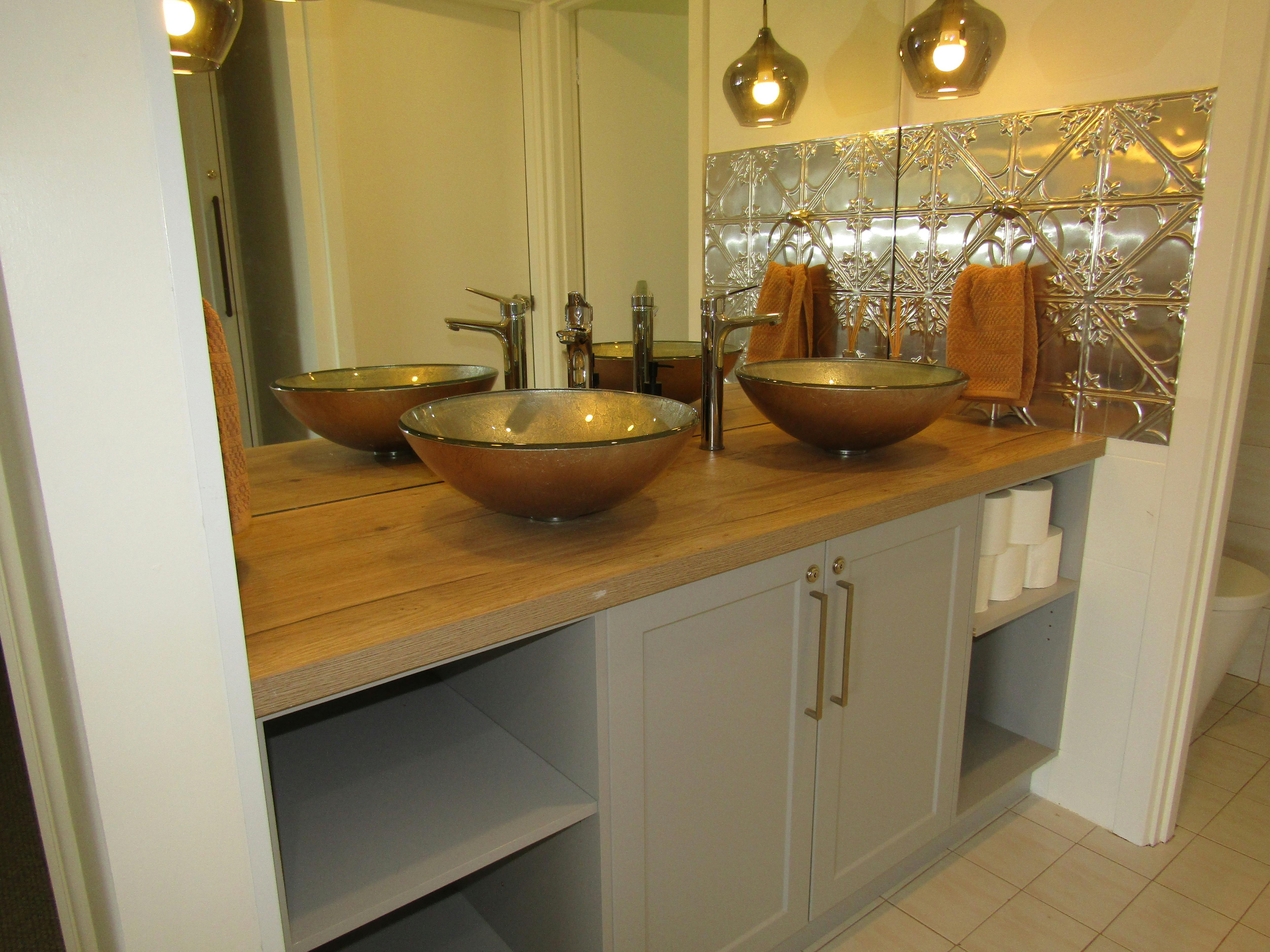 Bathroom with double bowl vanity, full size bath, walk in shower, separate w/c, laundry with top loading washing machine and dryer.