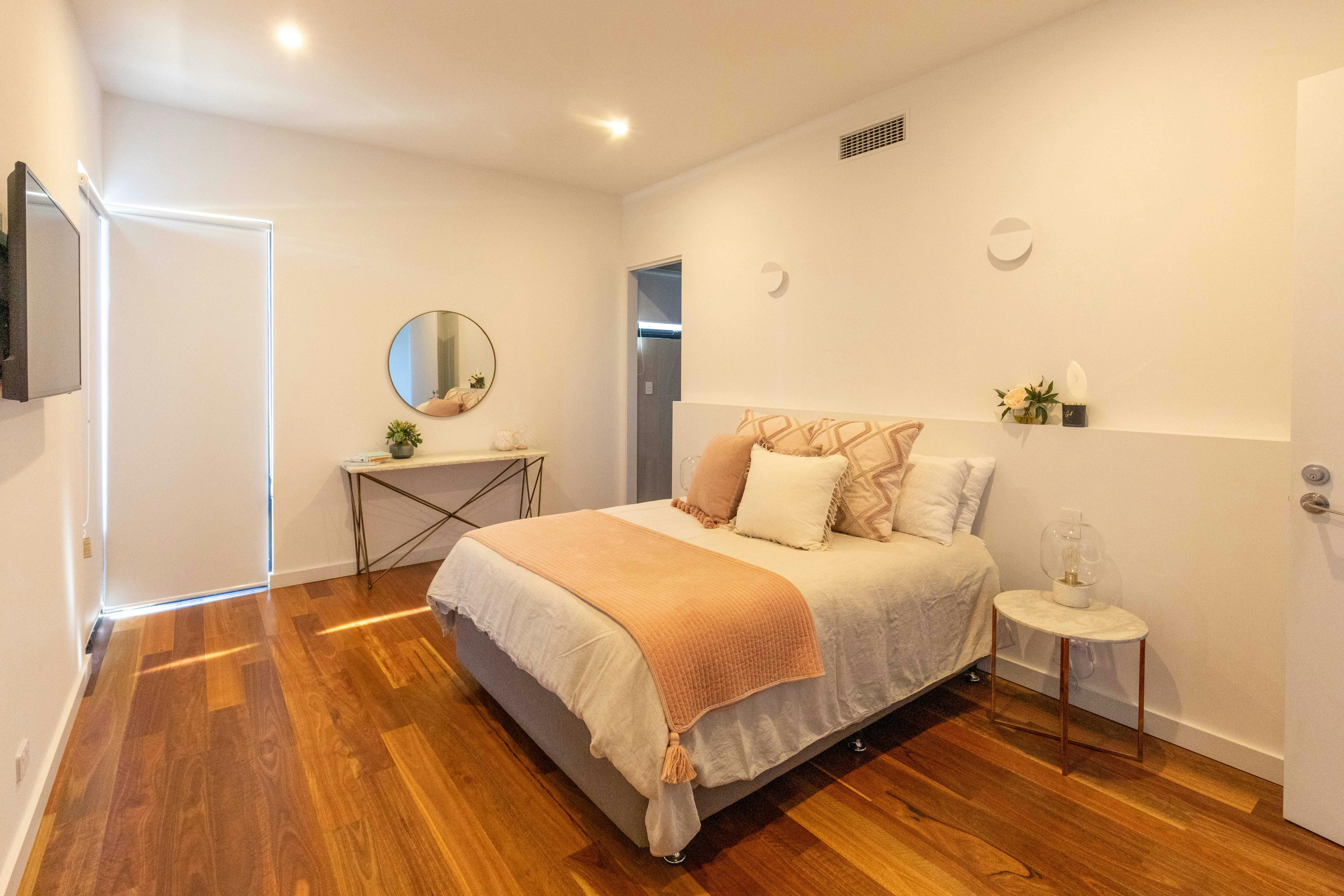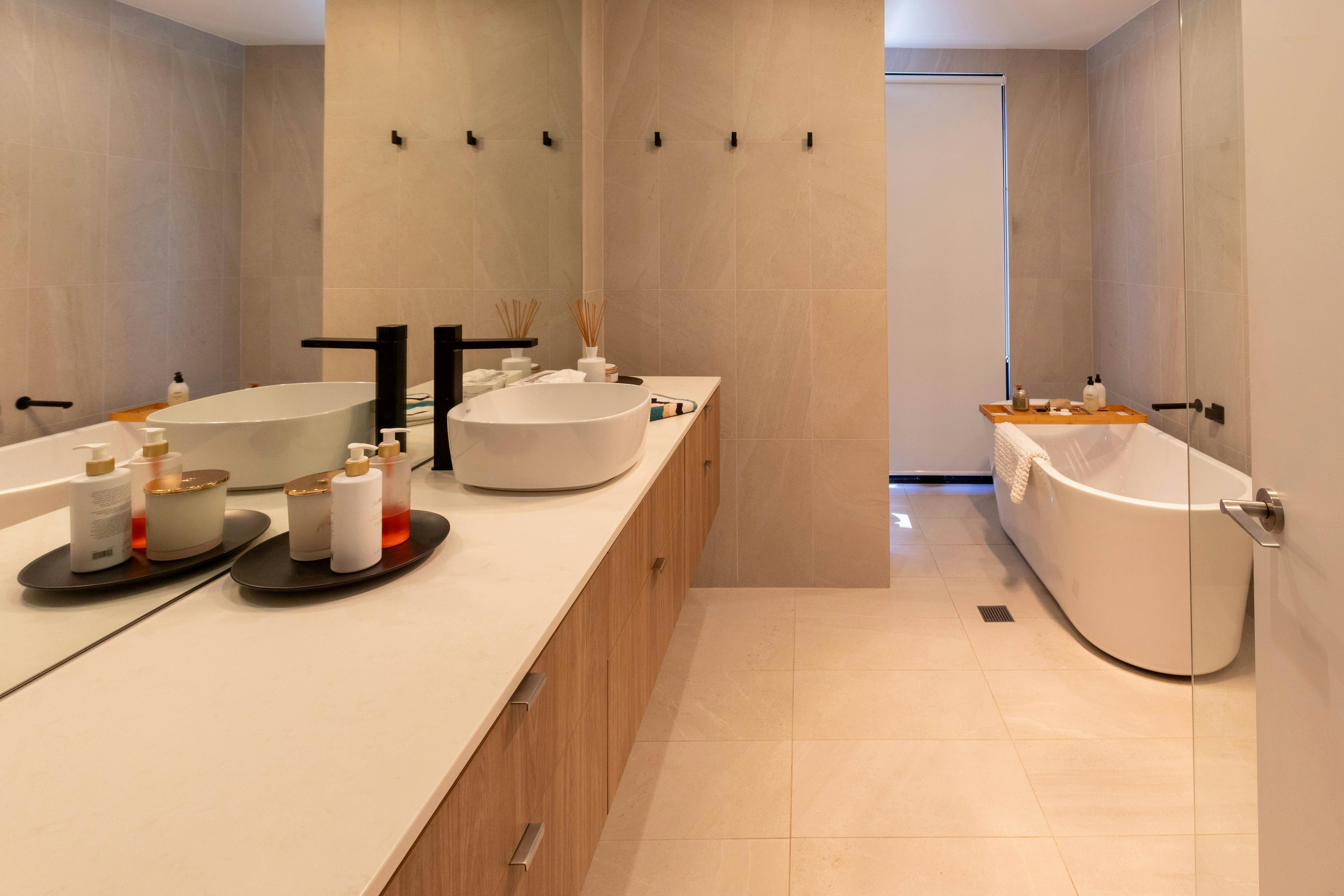 Luxury is evident throughout, featuring rich timber flooring, lofty ceilings, and deep freestanding soaker baths in both the main bathroom and the ensuite.
