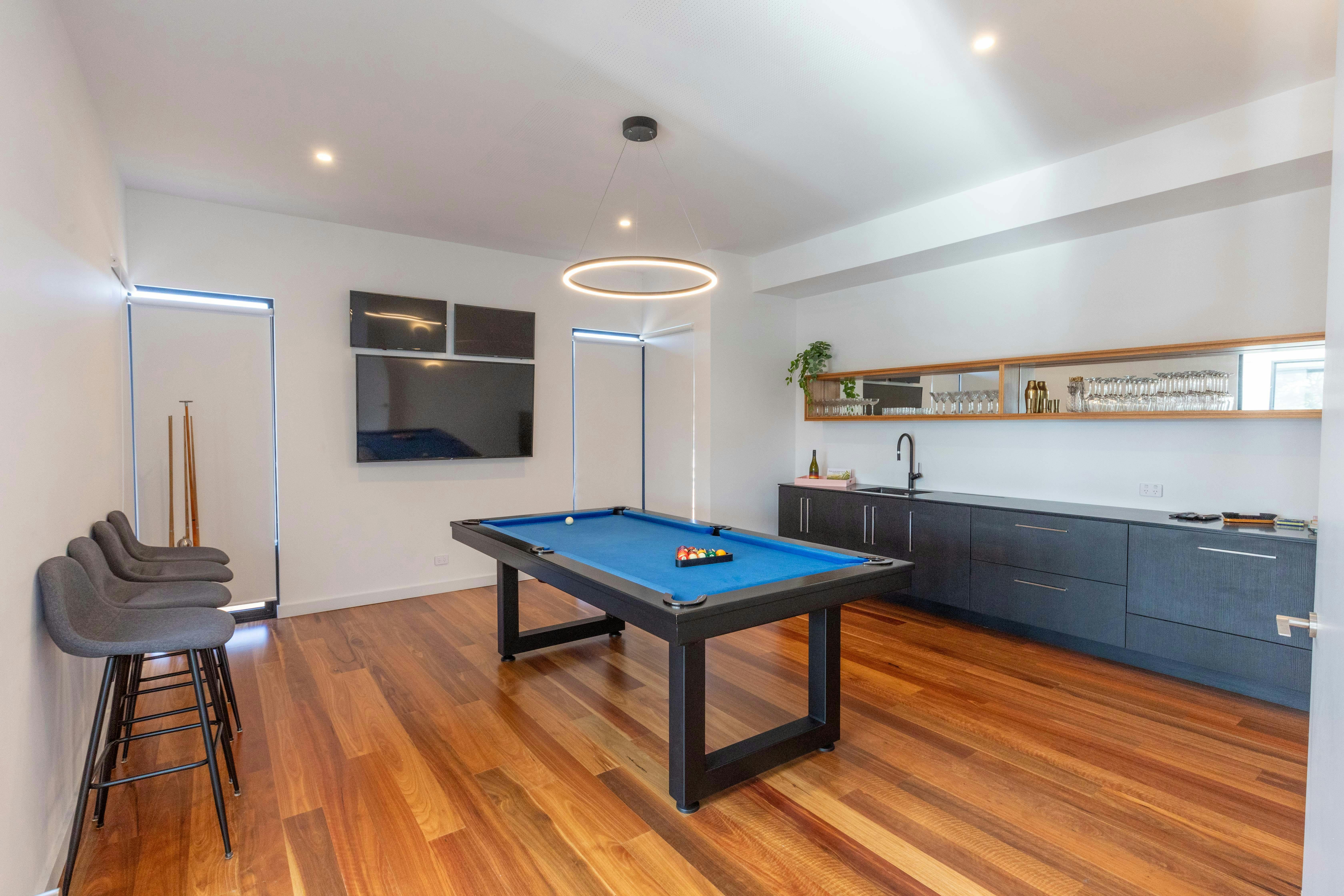 A separate entertaining room, with a full-width wet bar, integrated fridge and ice maker, and an acoustic ceiling, is currently used as an impressive pool room.