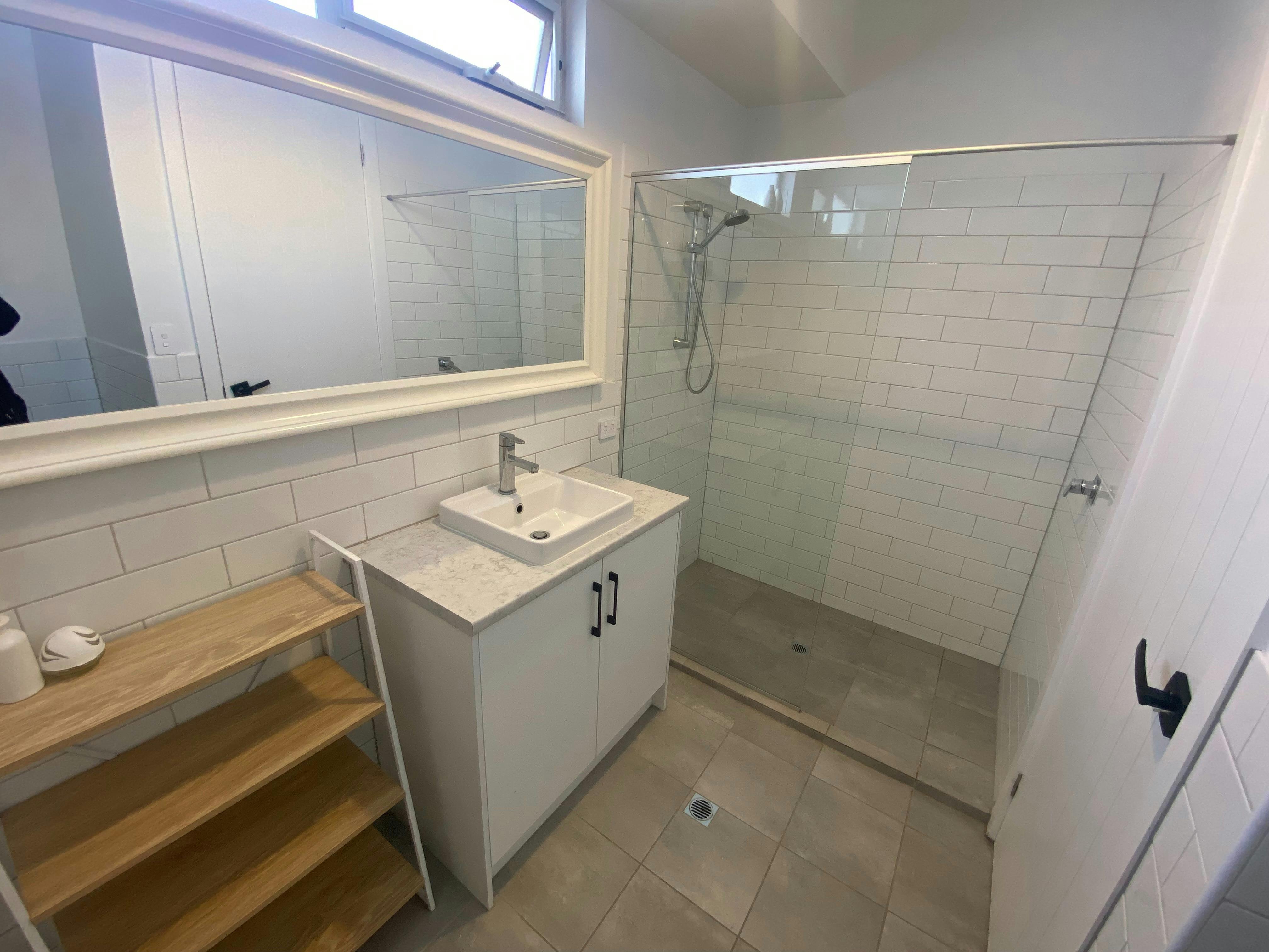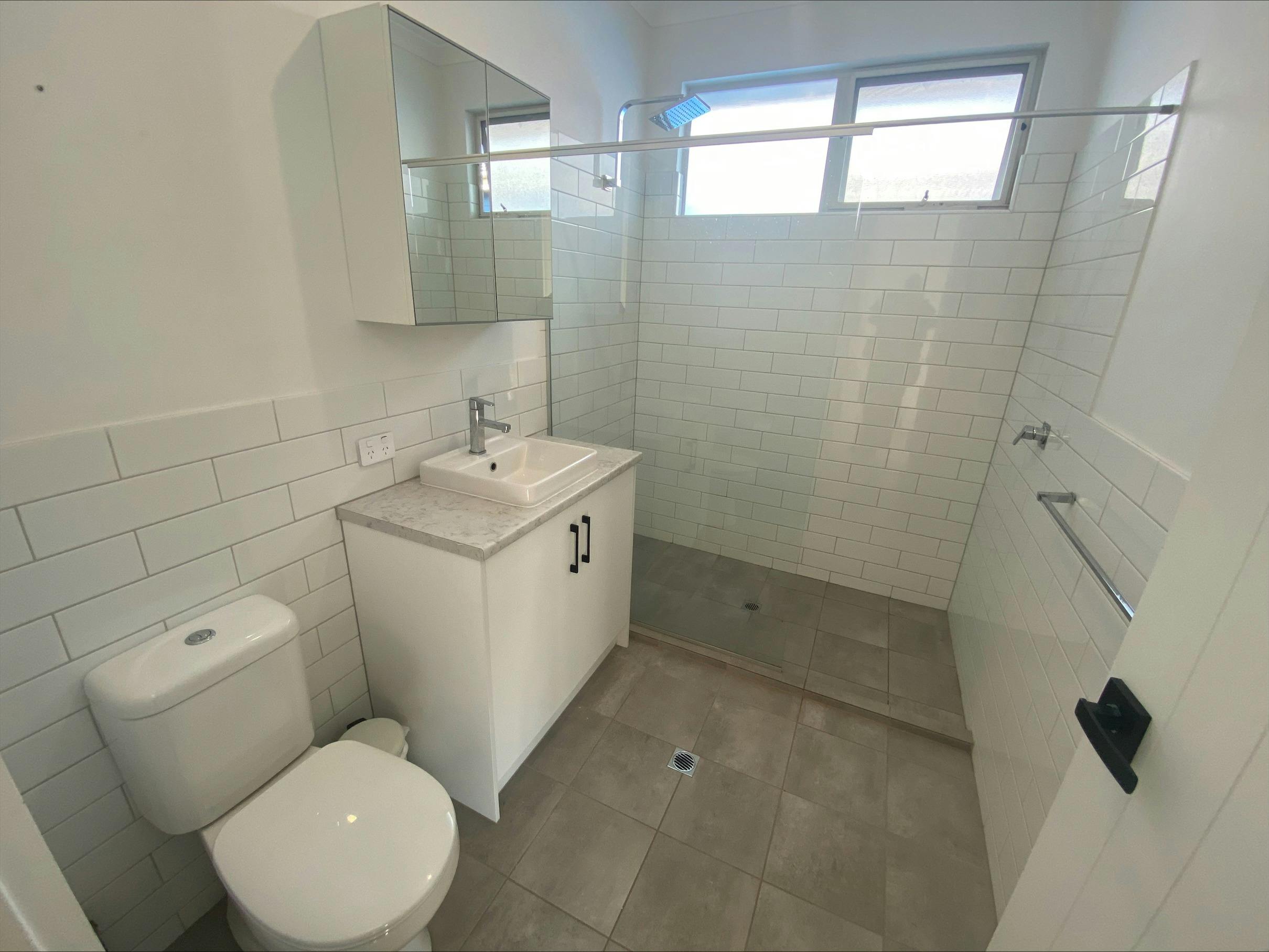 Main bathroom with vanity, walk-in shower, w/c. Main bedroom with built in robe, door leading out to rear deck, ensuite with vanity walk-in shower, w/c . Bedroom 3 with built in robe.