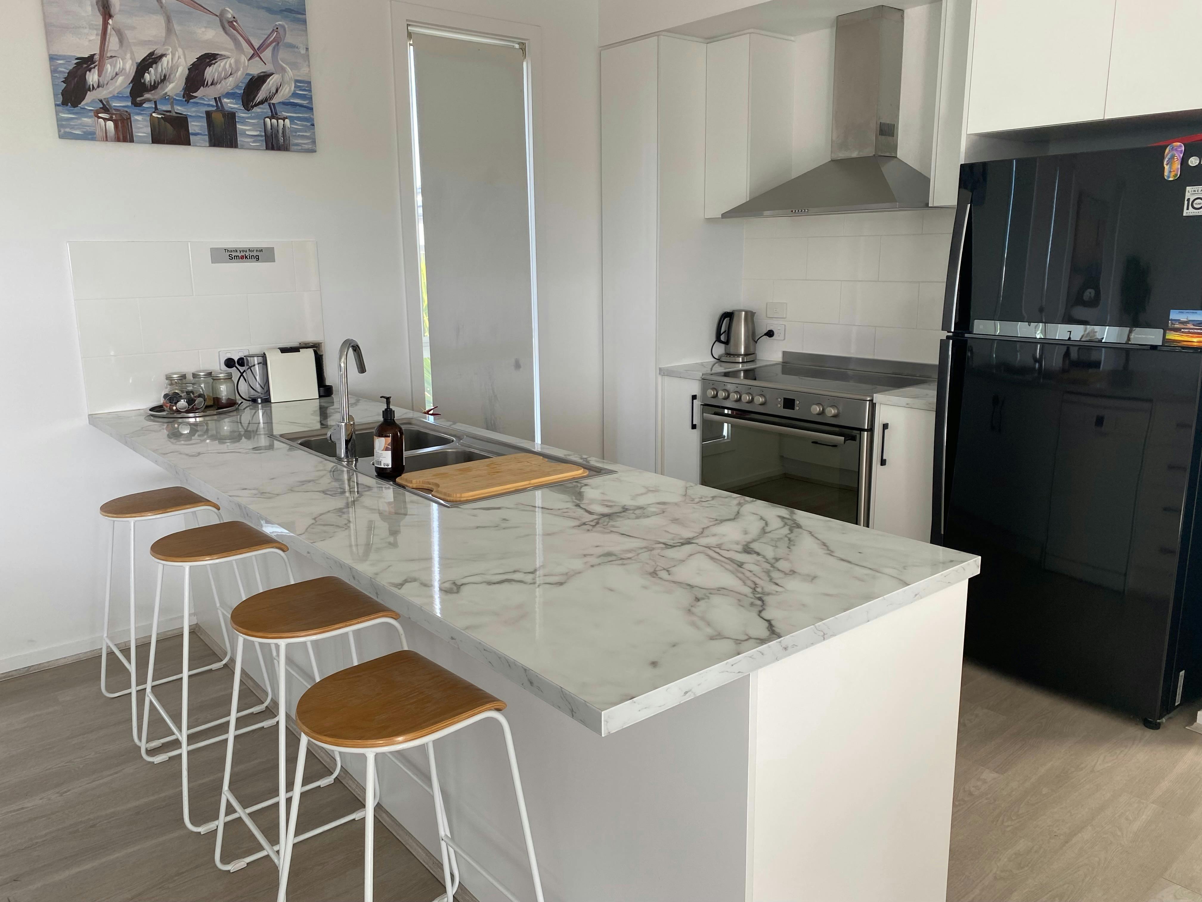 Open plan kitchen with large fridge/freezer, dishwasher, large electric oven/stove top, dual sink, microwave, Delonghi Nespresso coffee pod machine (BYO pods), toaster, kettle, wok. Dining area with 6 seater dining table, extra stools under kitchen bench.