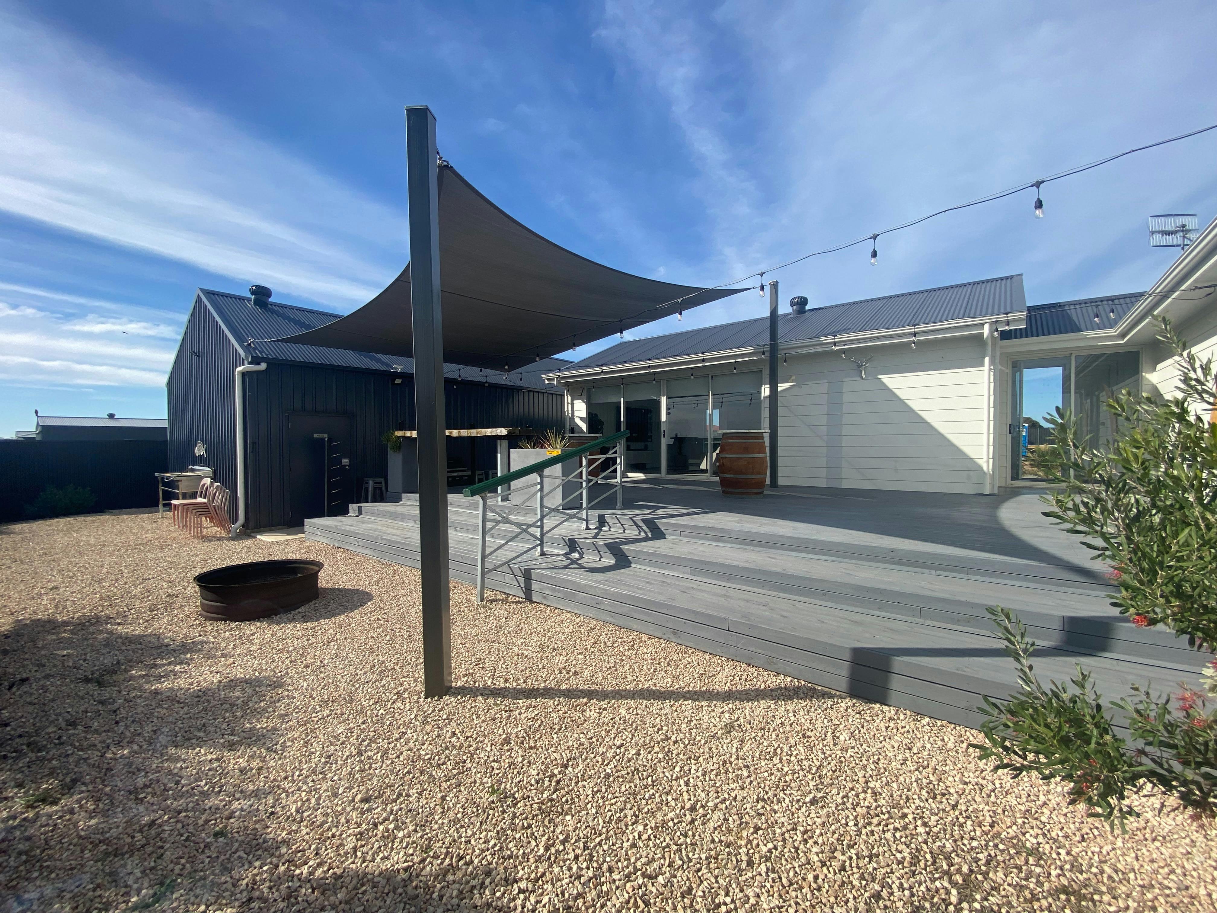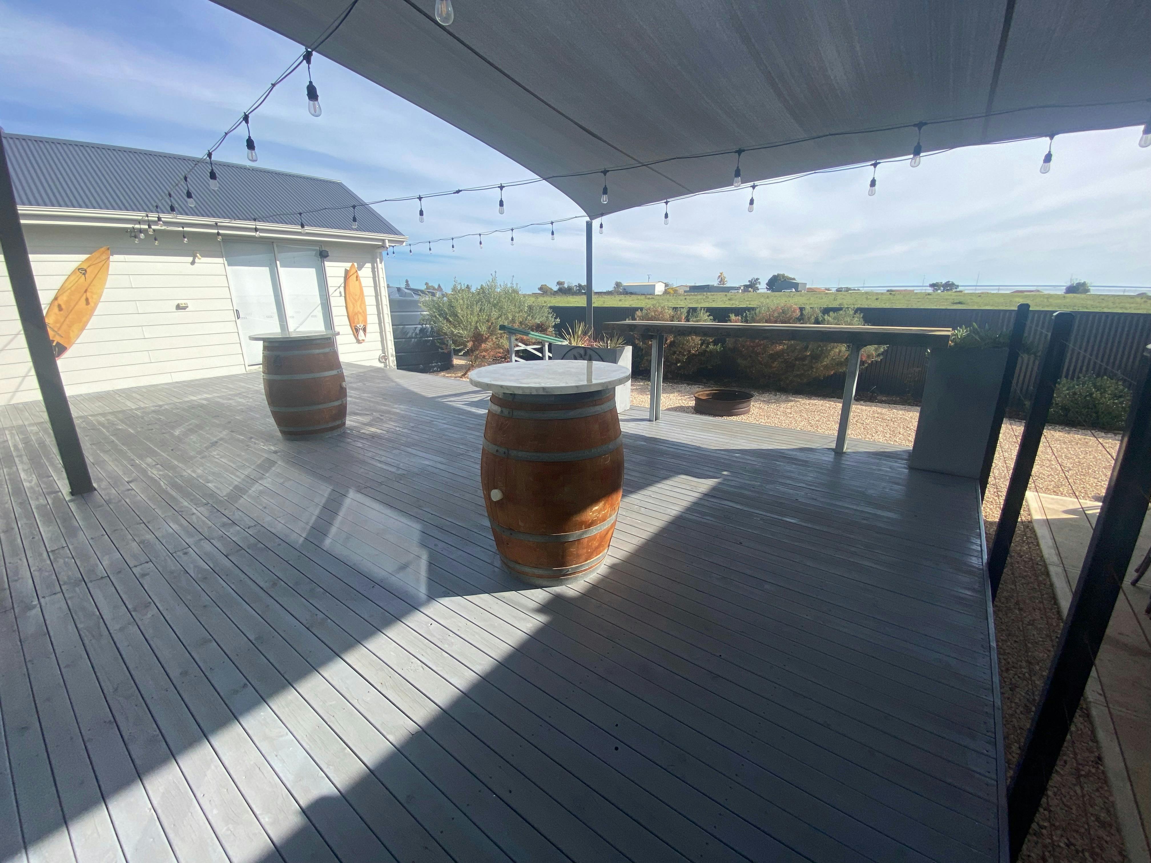 Step out from the living area on to a large deck with sail shade, bar with stools, 2 wine barrels, hooded gas BBQ, fire pit (BYO wood), fish cleaning facility.